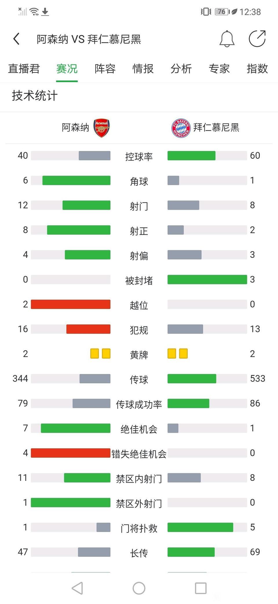看一下数据,阿森纳也没有完爆拜仁。 上半场还是1比1,下半场有机会的呀。 控球拜仁占优,射门也就少2次。 还是阿森纳整体实力,定位球厉害![大金牙]