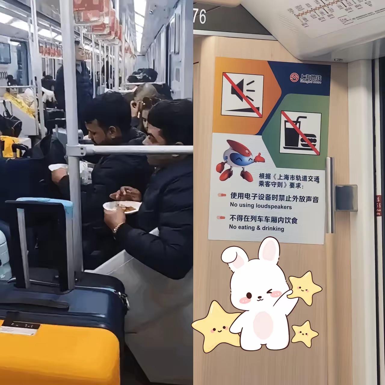 上海地铁这波回应,真的看得人火大到冒烟! 外籍人士在车厢里吃咖喱馅饼,那股冲鼻异味飘得满车厢都是,乘客捂鼻躲都躲不开,结果地铁轻飘飘一句“没巡视员,靠乘客反馈,一视同仁”就想打发人? 拜托,“一视同仁”不是免责金牌啊!难道因为没人巡查,违规进食就该睁一只眼闭一只眼?不管是外国人还是本地人,地铁里禁食是明文规定,遵守规则从来不是“入乡随俗”的额外要求,而是基本的文明底线。 真正的公平,不是嘴上喊着“一视同仁”,而是违规了就有监管、有处置,让规则真的能管住人。乘客花钱坐车是为了舒适出行,不是来忍别人的异味的,地铁的回应本质上是把管理责任推给了乘客。 文明从来不是靠自觉,而是靠实打实的规则落地,你觉得该怎么让地铁规则真正“长牙”?评论区聊聊!