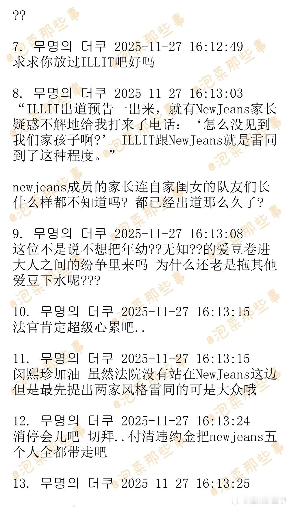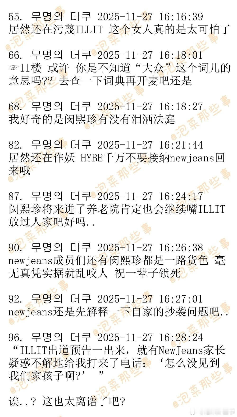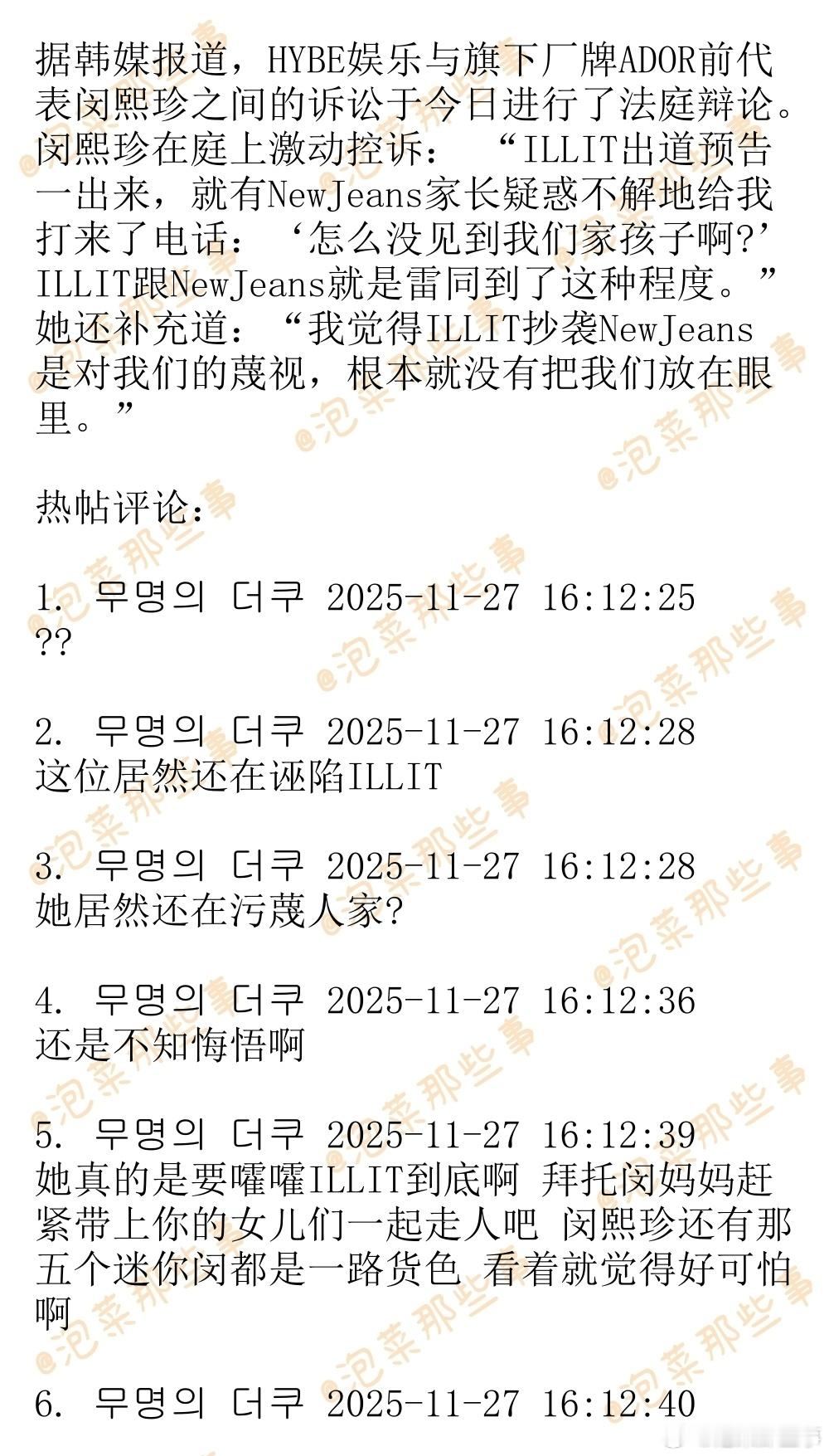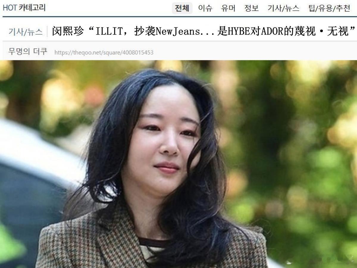 🔥韩网热帖评论翻译🔥闵熙珍再次指控illit抄袭闵熙珍:NewJeans家长看了ILLIT出道预告问我“怎么没见到我们家孩子啊”据韩媒报道,HYBE娱乐与旗下厂牌ADOR前代表闵熙珍之间的诉讼于今日进行了法庭辩论,闵熙珍在庭上激动控诉: “ILLIT出道预告一出来,就有NewJeans家长疑惑不解地给我打来了电话:‘怎么没见到我们家孩子啊?’ ILLIT跟NewJeans就是雷同到了这种程度。”她还补充道:“我觉得ILLIT抄袭NewJeans是对我们的蔑视,根本就没有把我们放在眼里。” cr.theqoo