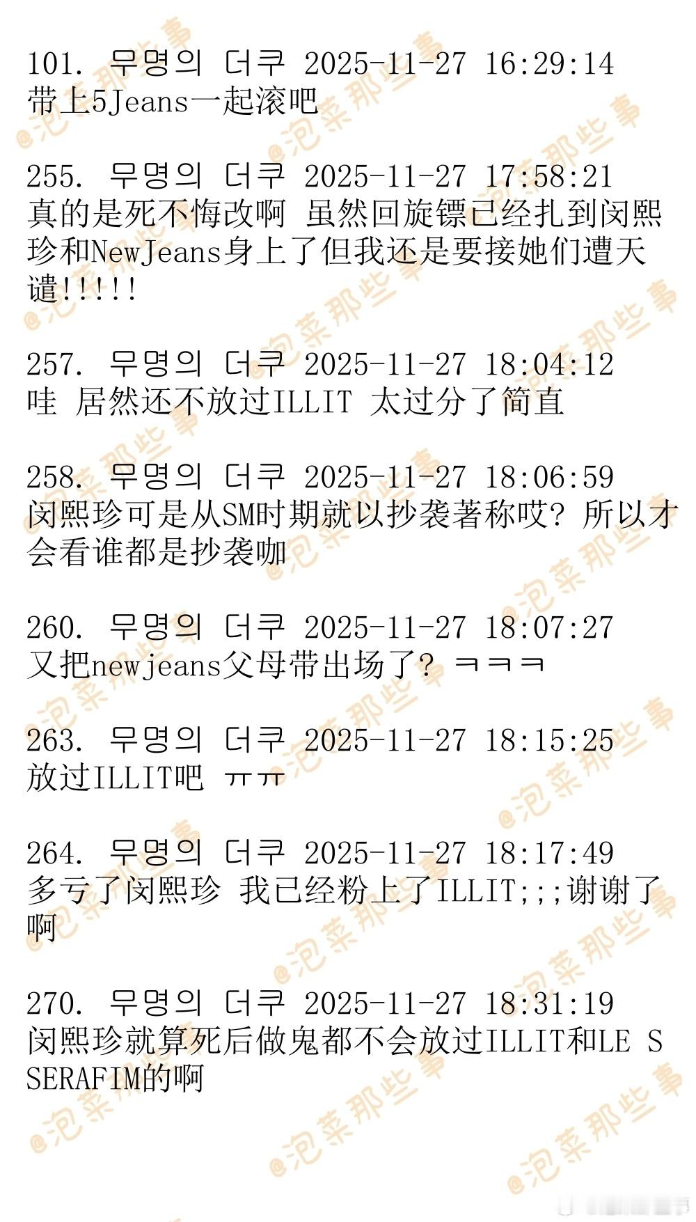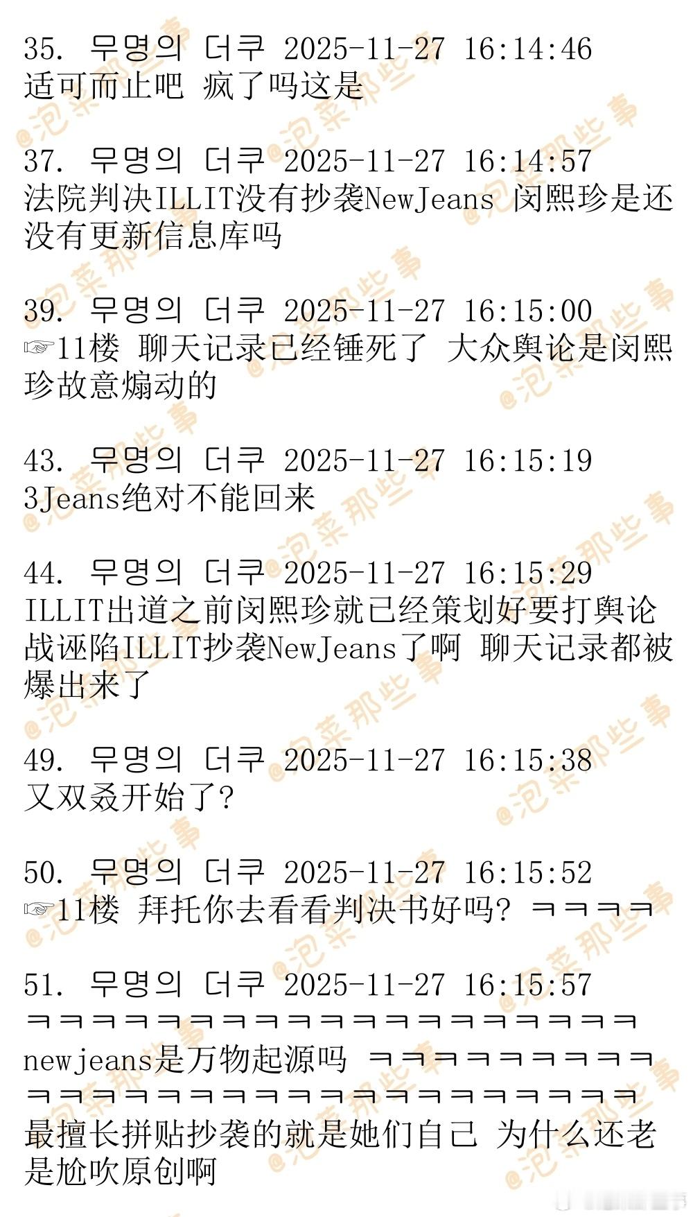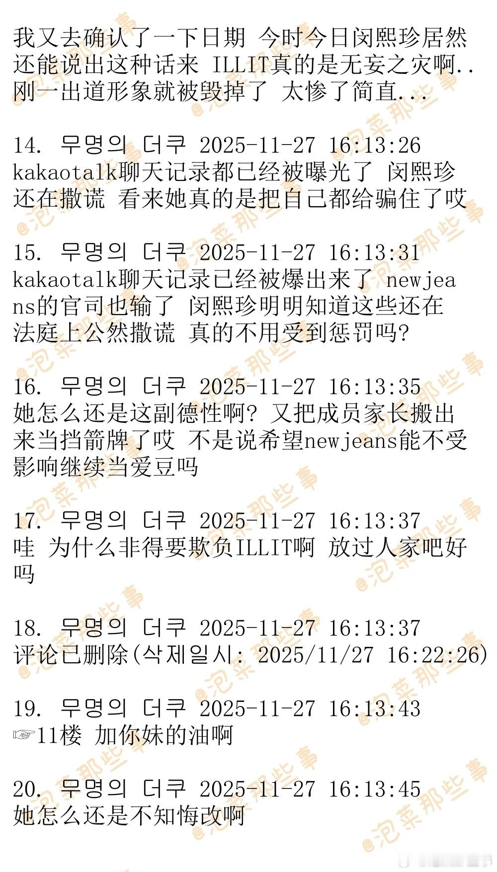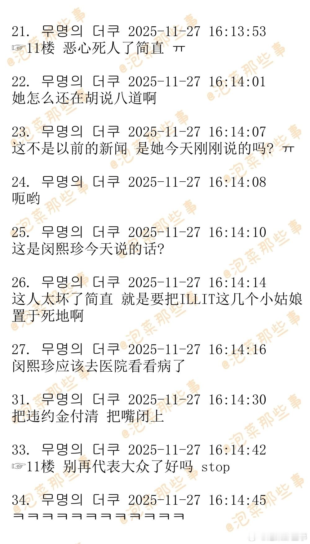 🔥韩网热帖评论翻译🔥闵熙珍再次指控illit抄袭闵熙珍:NewJeans家长看了ILLIT出道预告问我“怎么没见到我们家孩子啊”据韩媒报道,HYBE娱乐与旗下厂牌ADOR前代表闵熙珍之间的诉讼于今日进行了法庭辩论,闵熙珍在庭上激动控诉: “ILLIT出道预告一出来,就有NewJeans家长疑惑不解地给我打来了电话:‘怎么没见到我们家孩子啊?’ ILLIT跟NewJeans就是雷同到了这种程度。”她还补充道:“我觉得ILLIT抄袭NewJeans是对我们的蔑视,根本就没有把我们放在眼里。” cr.theqoo