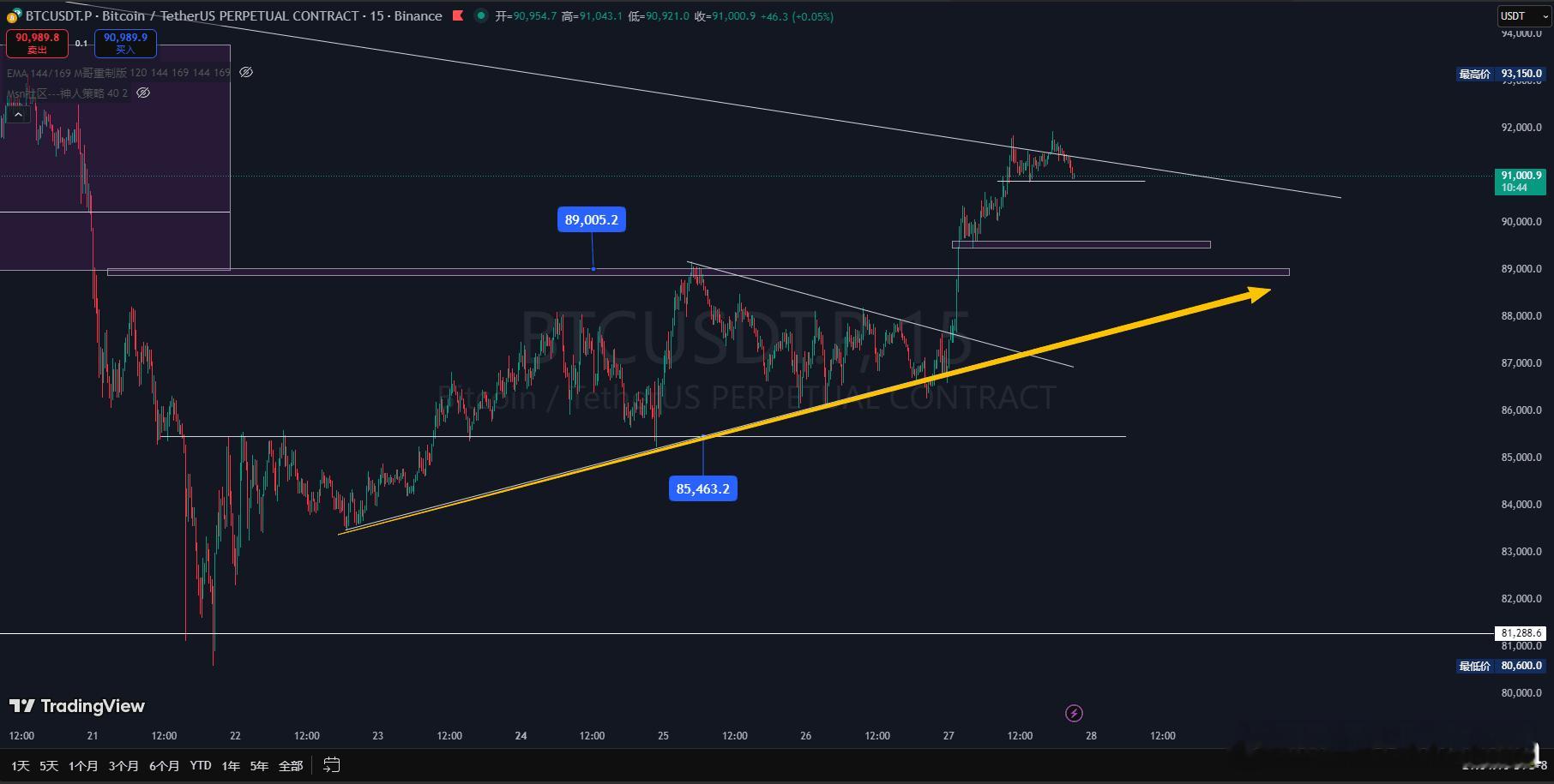 BTC 多头结构做低多。昨日观点,89000这一带突破后的上涨目标在91500附近,日内已抵达。---小级别,我更愿意观察89600这个起涨点的支撑情况来介入低多订单。---上方93200可能形成阶段强压。