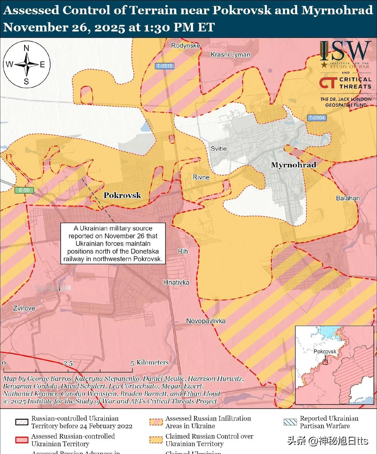 尽管波克罗夫斯克局势目前依然严峻且瞬息万变,但乌克兰近期的反击可能进一步延缓俄军占领波克罗夫斯克的进程。乌克兰军队近期在波克罗夫斯克北部和西北部的反击持续减缓俄军向波克罗夫斯克方向的推进速度。11月26日一位乌克兰军方消息人士报告称,乌克兰军队在反击中重新夺回了波克罗夫斯克西北部和西部的关键阵地;一位乌克兰记者报道称,乌克兰军队在波克罗夫斯克北部靠近顿涅茨克铁路沿线推进,阻止了俄军向格里申(波克罗夫斯克西北部)方向推进。俄乌双方军队可能都在波克罗夫斯克北部占据阵地。11月26日发布的地理定位视频显示,俄军也渗透到了波克罗夫斯克东北部的阵地。俄罗斯方面还声称,乌克兰军队在波克罗夫斯克西北郊区以及赫里希涅(波克罗夫斯克西北部)和罗丁斯克(波克罗夫斯克北部)附近发动了反击,这与乌克兰方面关于在波克罗夫斯克北部推进的报告相符。俄乌双方军队可能都在波克罗夫斯克北部占据阵地。乌克兰空降突击部队第7快速反应军发言人谢尔盖·奥基舍夫于11月26日报告称,乌克兰军队在波克罗夫斯克保持着阵地,前线主要沿顿涅茨克铁路线延伸,这与近期有关俄军已占领顿涅茨克铁路线以南地区的报道相符。第七军指出,俄军继续试图包围米尔诺赫拉德,并从南北两个方向进攻该镇。米尔诺赫拉德市军事管理局局长尤里·特列季亚克表示,俄军正从里夫内和斯维特列附近的西部发起进攻,所有这些行动很可能是为了将乌克兰军队困在米尔诺赫拉德城内,同时收紧对米尔诺赫拉德的包围圈。乌克兰东部集团军于11月26日报告称,乌克兰军队正在调整策略,以应对俄军切断乌克兰通往波克罗夫斯克和米尔诺赫拉德后勤补给的企图,包括构筑防护网走廊、用防空系统覆盖后勤路线,以及使用重型无人机和无人地面车辆(UGV)进行后勤运输。战略情报局(ISW)继续评估认为,经过21个月的战役,俄军很可能完成对波克罗夫斯克和米尔诺赫拉德的占领,但目前完成占领行动的时间和作战影响尚不明确。