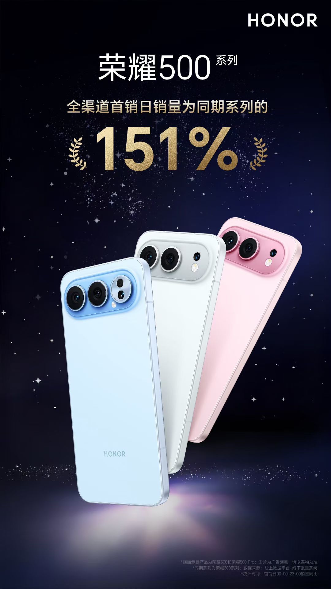 荣耀500系列首销日当天为荣耀300系列的151%,成绩挺好的没有年中的高考季毕业季,也没有夏促,除了个别地区外,没有国补,都是会有影响的