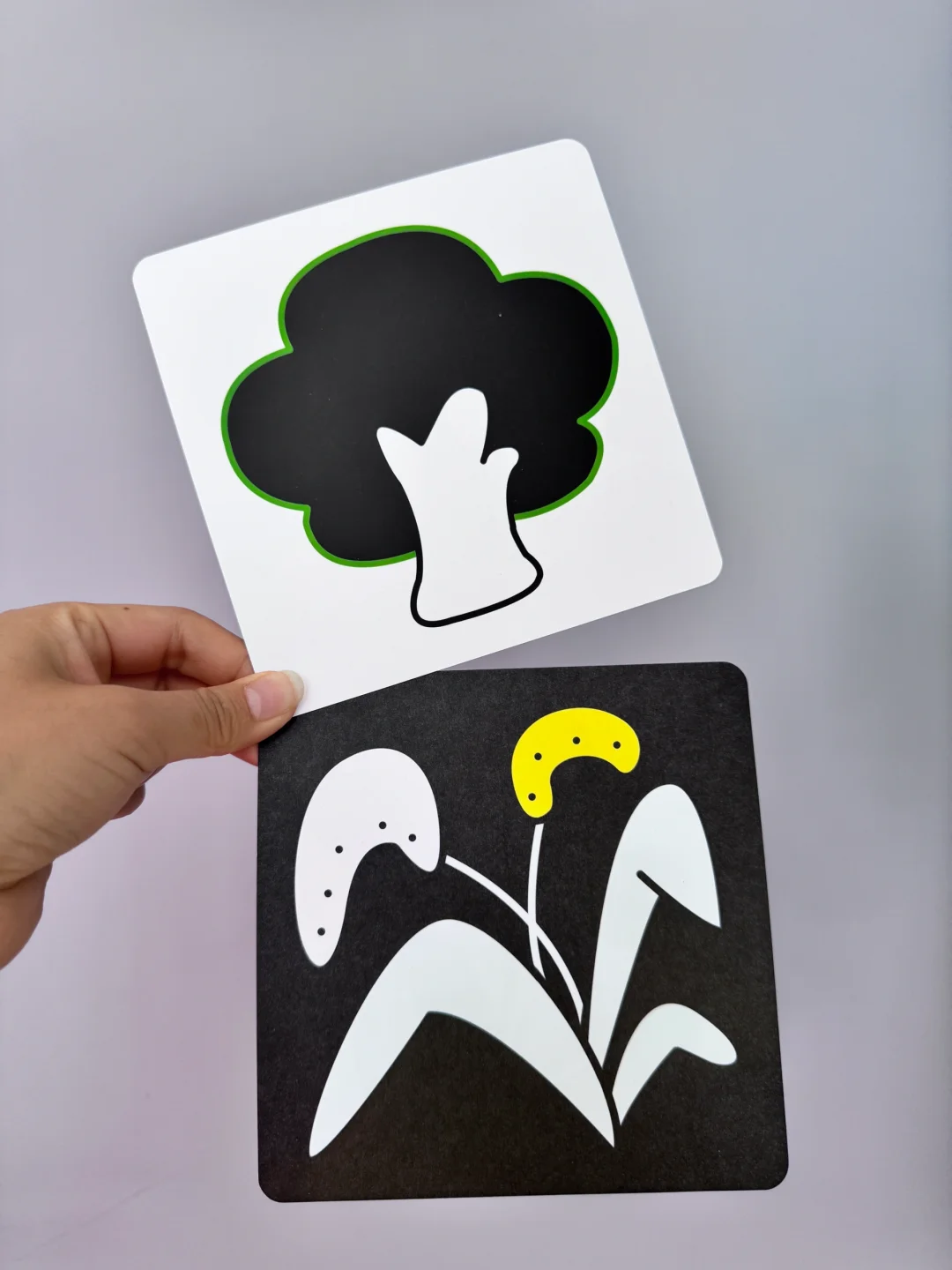 手持黑白卡距离宝宝脸30-45厘米,说出卡片名称,等到宝宝看清图片后,慢慢向上、下、左、右移动卡片,宝宝的视线会追随着移动