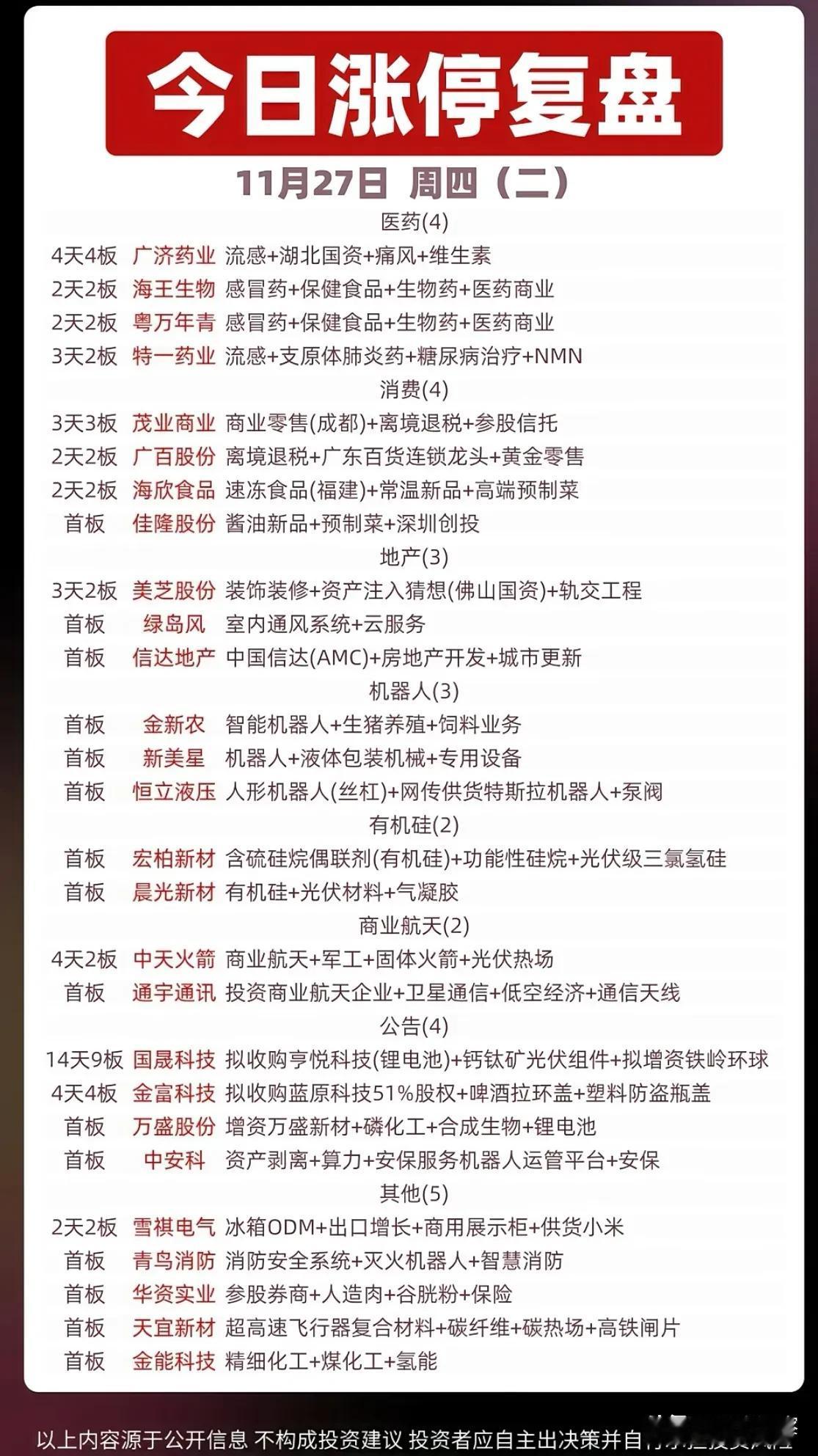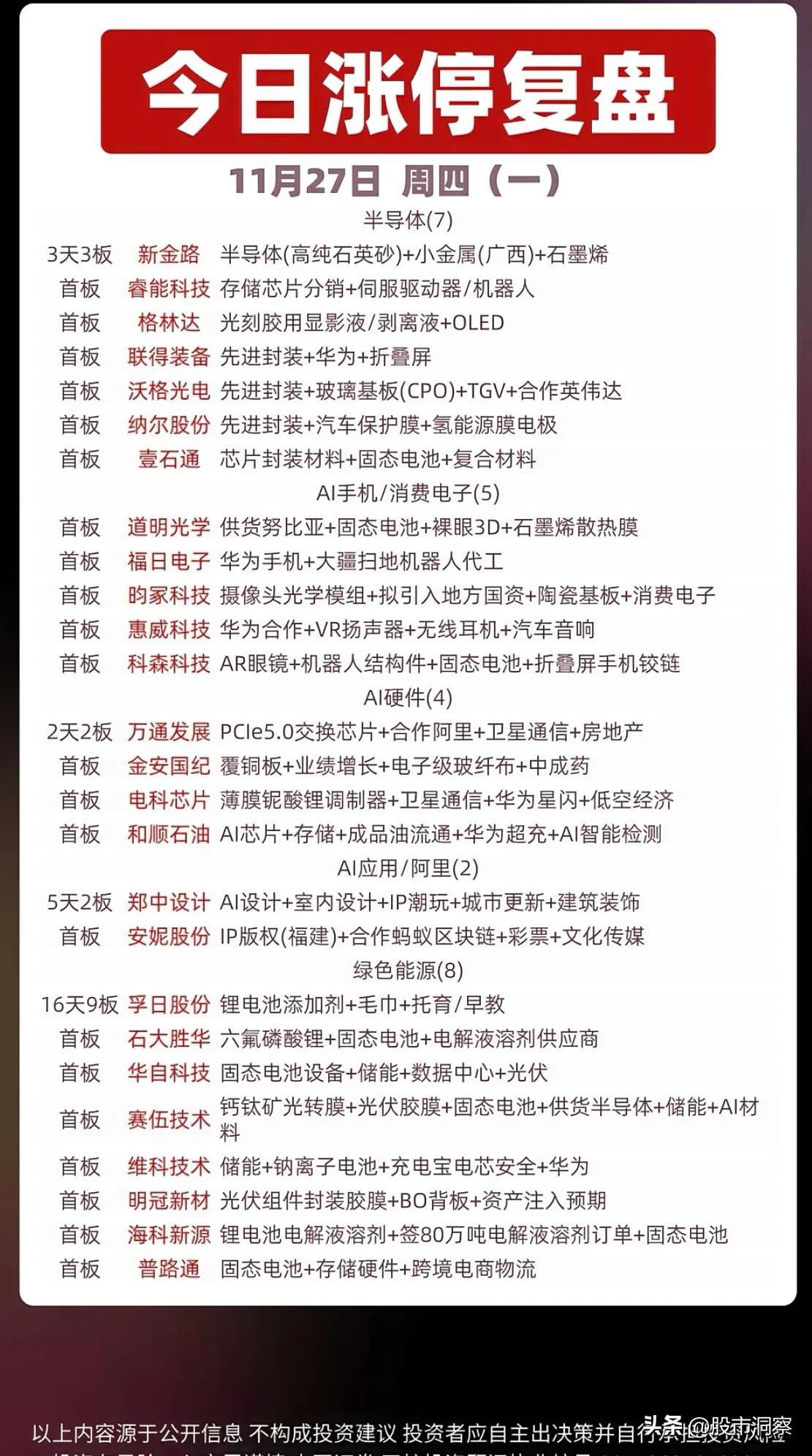 11月27日涨停复盘:市场热点板块深度解析 从今日市场表现来看,多个板块呈现结构性活跃,资金围绕半导体、绿色能源、AI硬件及医药等主线进行布局。 半导体板块今日表现亮眼,板块内多只个股涨停。在先进封装、光刻胶等细分领域尤为活跃,反映出市场对半导体产业链国产化进程的持续看好。随着人工智能、智能驾驶等新兴技术对芯片算力需求的不断提升,半导体产业长期发展潜力依然可观,预计相关细分领域仍将维持较高市场热度。 绿色能源领域同样掀起涨停潮,特别是固态电池、光伏材料等方向表现突出。在“双碳”目标持续推进的背景下,新能源技术革新与产业化应用仍是市场关注焦点。随着储能、钠离子电池等技术的不断突破,该板块具备中长期成长空间,但需注意技术路线演进中的波动风险。 AI硬件与消费电子板块热度不减,从AI手机到AR眼镜、伺服驱动器等,显示出人工智能技术与终端硬件融合的加速。在AI应用场景持续拓展的驱动下,硬件创新周期有望延续,但投资者需关注技术落地进度与产业链竞争格局的变化。 医药板块受流感季节等因素催化,连续多个交易日表现活跃。感冒药、保健食品等细分方向受到资金关注,反映出市场对公共卫生事件的敏感性。医药行业兼具防御与成长属性,在人口老龄化与健康消费升级背景下,中长期发展逻辑依然稳固。 此外,商业航天、机器人、有机硅等新兴或细分板块也有所表现,显示出市场资金在寻找多元化投资机会。整体来看,当前市场仍以题材轮动为主要特征,投资者应保持理性,把握产业趋势与政策导向,注意分散风险。 半导体芯片股票 芯片板块 半导体板块 半导体行业指数 板块机会分析 深入科技股分析 涨停行业分析 半导体芯片股 龙虎榜 涨停 涨停板 股市分析 股票知识