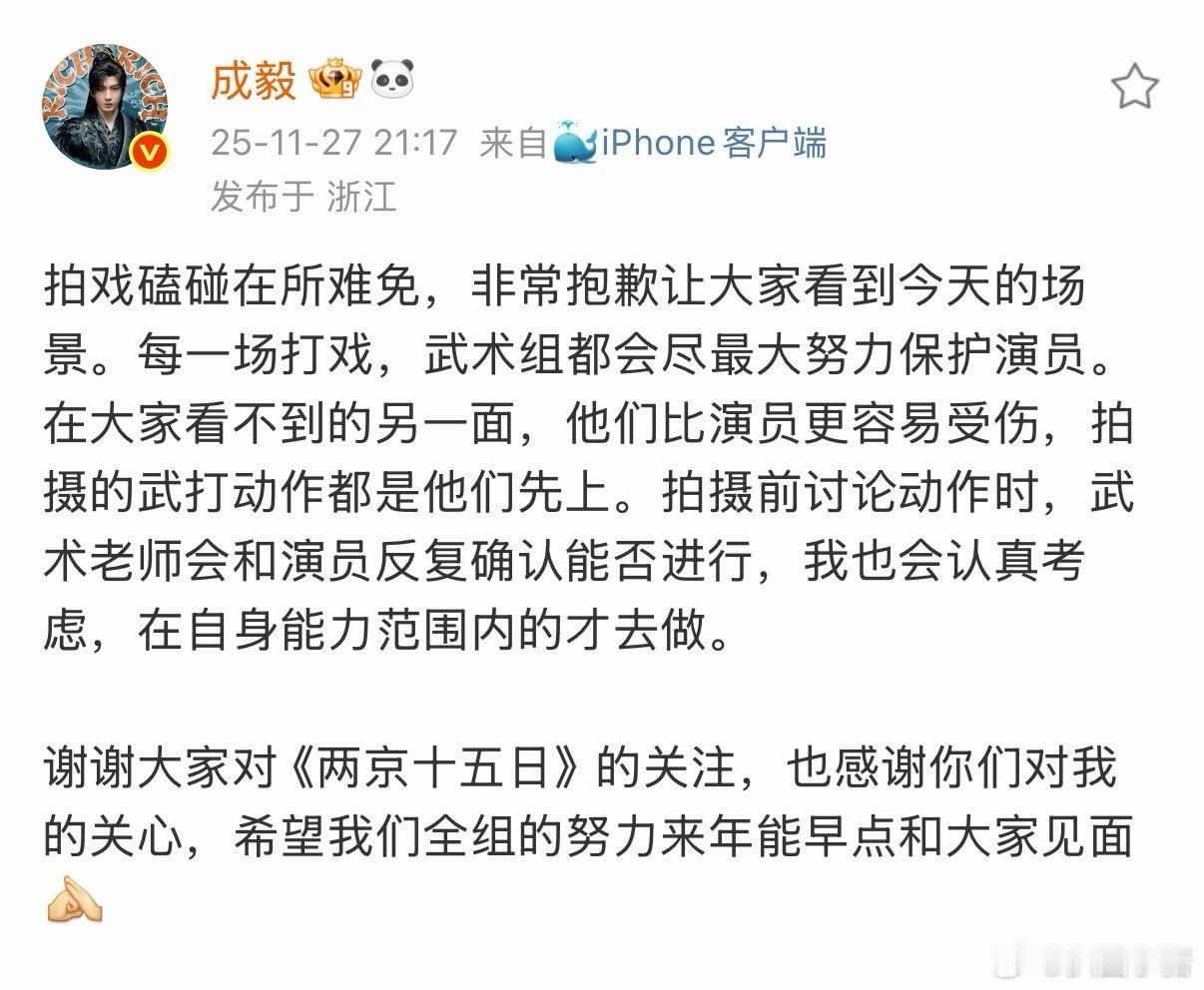 成毅发文报平安了,拍戏磕碰在所难免,非常抱歉让大家看到今天的场景。每一场打戏,武术组都会尽最大努力保护演员。感谢大家对他的关心。成毅又受伤了 成毅回应两京十五日拍摄受伤