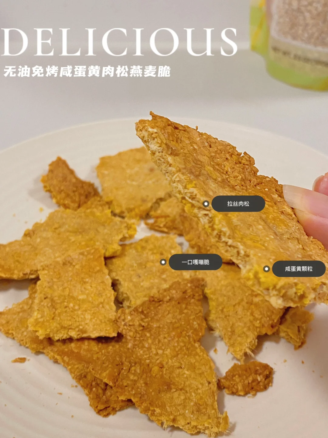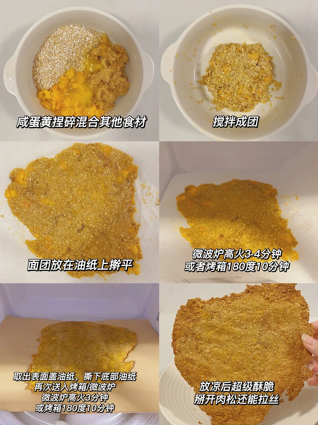 👩‍🍳哦莫,爱吃咸蛋黄味儿的零食却怕胖的姐妹在哪‼️低卡版的咸蛋黄“锅巴”,一定要试试‼️关键无油无米,免烤还能嘎嘣脆,咸香酥脆,真的超好吃‼️ 💕4种食材就搞定|烤箱/微波炉都🉑️ 🌈减脂、健身、咸蛋黄爱好者、肉松脑袋闭眼入‼️ . 🍃食材(289卡/个-8寸👉附热量表): 咸蛋黄1个 无糖肉松10g 好哩燕麦麸皮35g(🉑️换即食燕麦片) 鸡蛋1个(约35g) 🌈鸡蛋(克数)建议和燕麦差不多,这样混合的比例最完美;一整块约8寸大小,2-3cm厚 . 📖简单步骤一看就会,直接翻图7⃣️ 🌈微波炉和烤箱版自行选择;两者口感都超级酥脆,记得要翻面哦 . 食材简单,美味不简单‼️ 燕麦做的锅巴,低GI,解馋饱腹两手抓,配个咖啡牛奶都很nice‼️外面卖的锅巴每百克都有500多卡,自制的热量直接减半,这不香嘛‼️ ㊗️仙女们越吃越瘦‼️