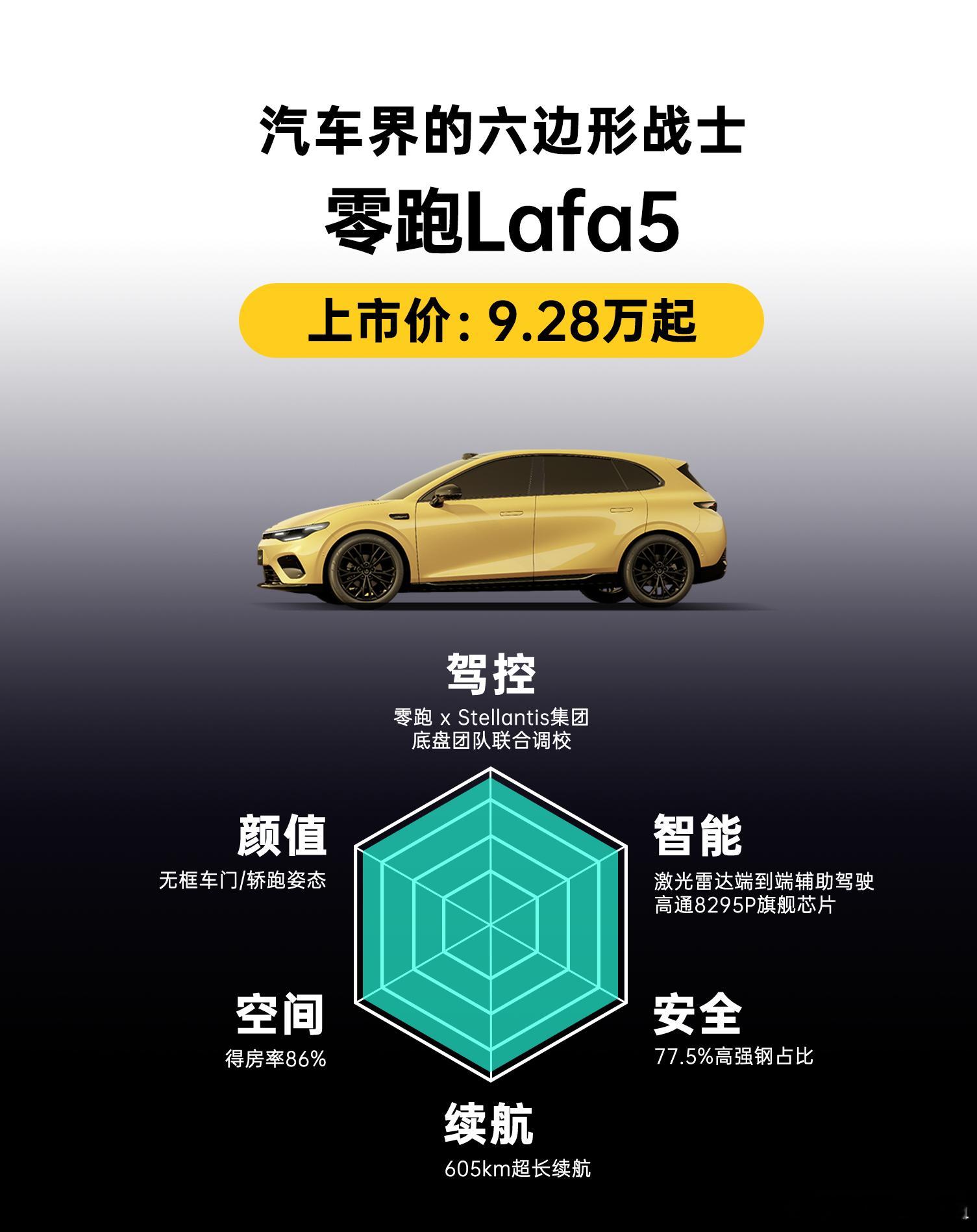 赫拉利在《人类简史》里有个经典观点:科技会一次次把原本奢华的好东西让更多人用上。在汽车行业,这个观点被体现得淋漓尽致,而零跑在这方面正在领跑🏃之前我还说零跑只有做SUV才最成功,现在已经挑战新车型了:全球个性战略新品Lafa5正式上市,即日起至2025年12月31日24点,限时惊喜价格9.28万起。燃油时代想花15万买个性运动座驾,大家第一反应都是GTI这类车,但新能源时代,Lafa5直接把逼格拉满还加配。无框车门+19寸轮毂的轿跑造型,20万级仿麂皮+Nappa真皮内饰,后驱布局搭配Stellantis联合调校底盘,5.17m同级领先转弯半径+6.4秒加速,34500N·m/deg车身刚性更是改装党福音,颜值质感操控还有可玩度都在线。零跑今年提前达成50万销量,明年冲击100万,很好奇看看这款新能源时代没啥竞品的“电动高尔夫”,最终能给零跑贡献多少销量~零跑Lafa5开启轿跑10万级时代年轻人首选Lafa5限时9.28万起
