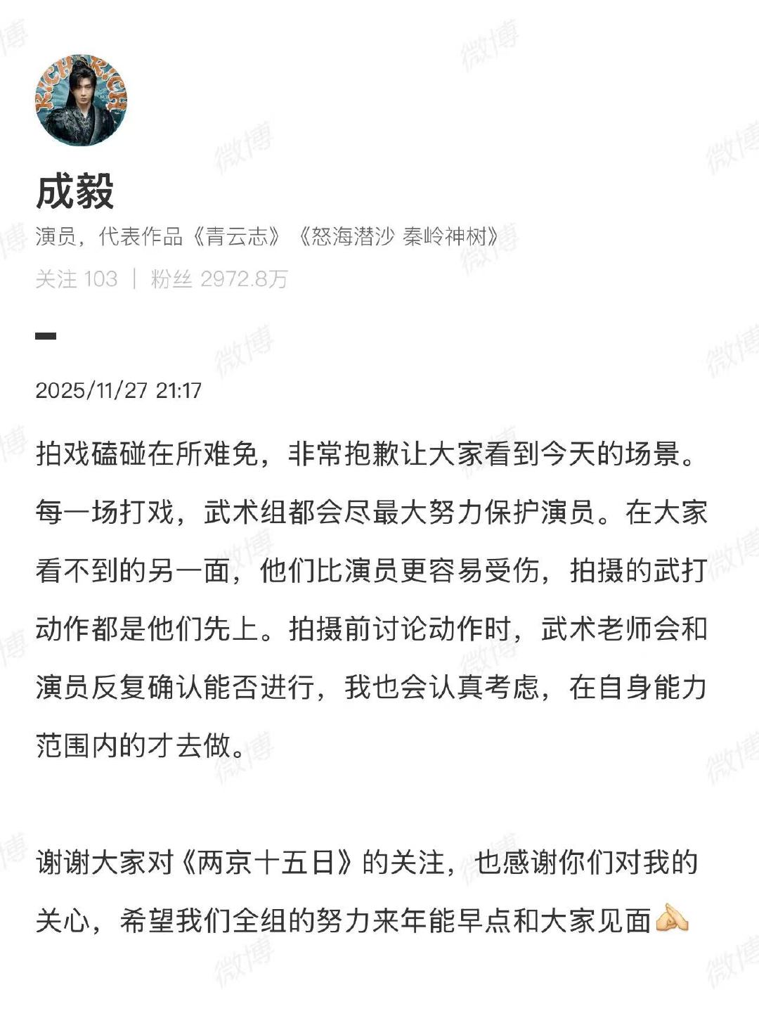 成毅武术组都会尽最大努力保护演员 成毅报平安的同时不忘感谢武术组的保护,把温暖和安全感都给到位了~果然真诚永远是必杀技,以后也请安全第一!