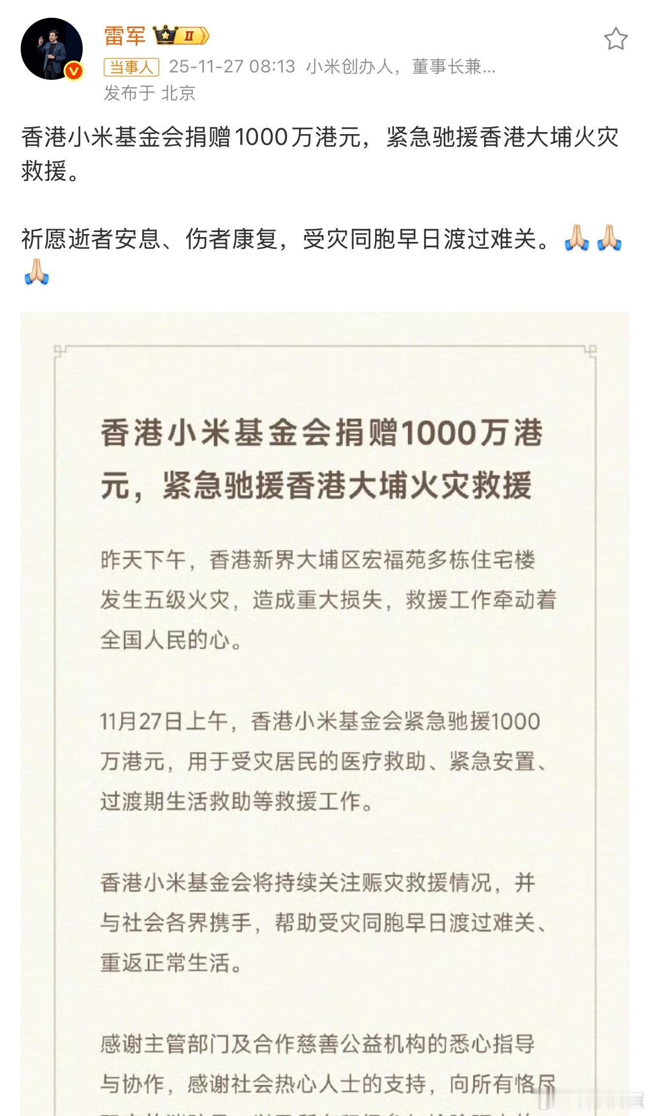 香港小米基金会捐赠1000万港元在当下社会,企业若能超越商业利益,积极回馈社会,这种价值是尤为珍贵的也同样希望受灾同胞早日渡过难关