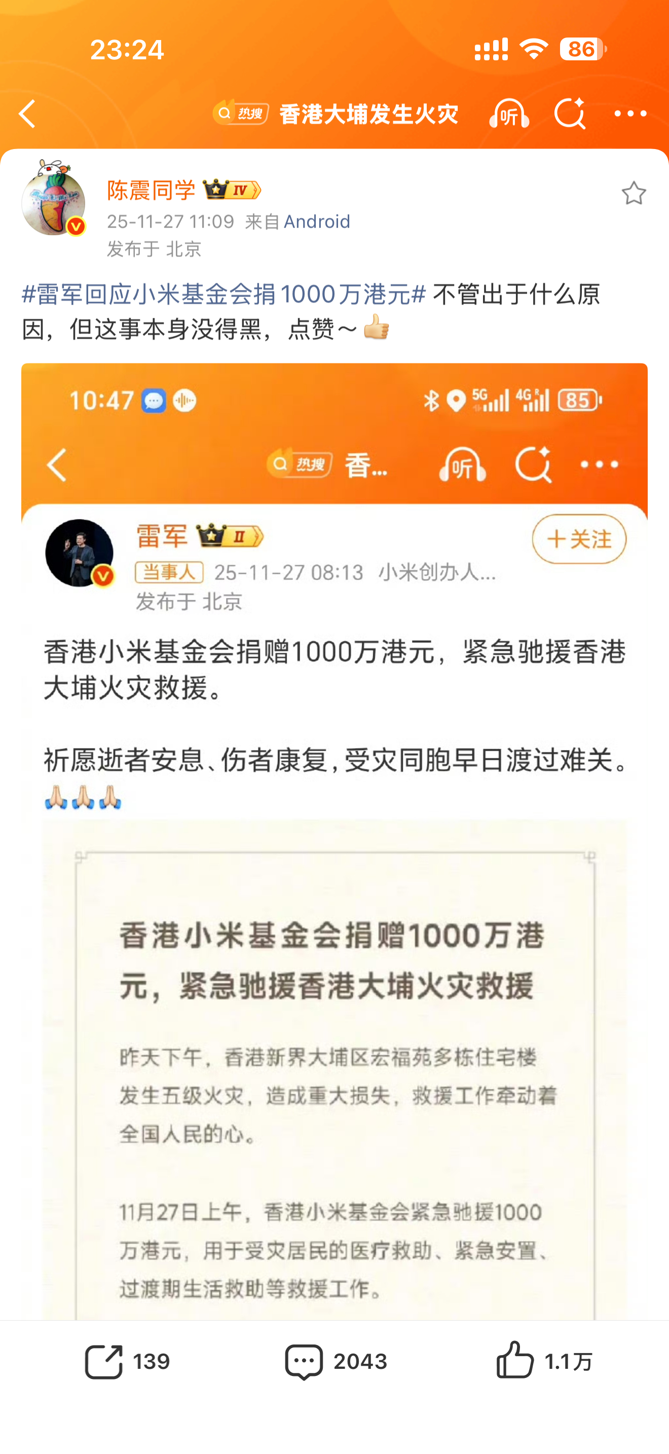 雷军回应小米基金会捐1000万港元其实我对陈震这个人还挺喜欢的。但是这句话的前半句,确实挺招人厌的。平时我也是吃瓜居多,这次我是实在忍不下去了。还能是出于什么原因呢?为啥非要加前面一句话呢?不理解,🤔看来愤怒的,不止是我一个人