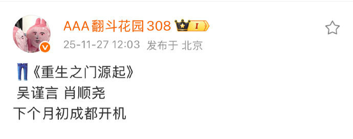 👖《重生之门源起》 吴谨言 肖顺尧,下个月初成都开机 看得出这个市场没有二番生