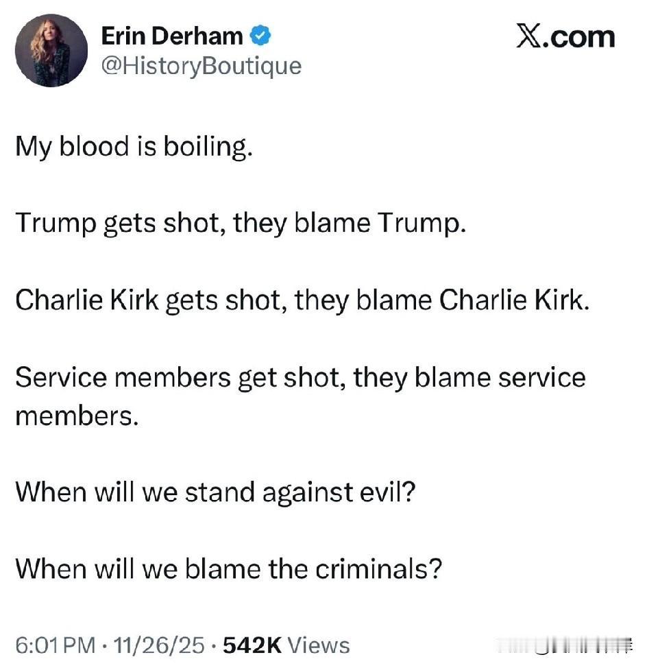 我怒火中烧。 川普中枪,他们怪川普。 Charlie Kirk 中枪,他们怪 Charlie Kirk。 军人中枪,他们怪军人。 我们什么时候才会挺身对抗邪恶? 我们什么时候才会把责任归咎于罪犯?