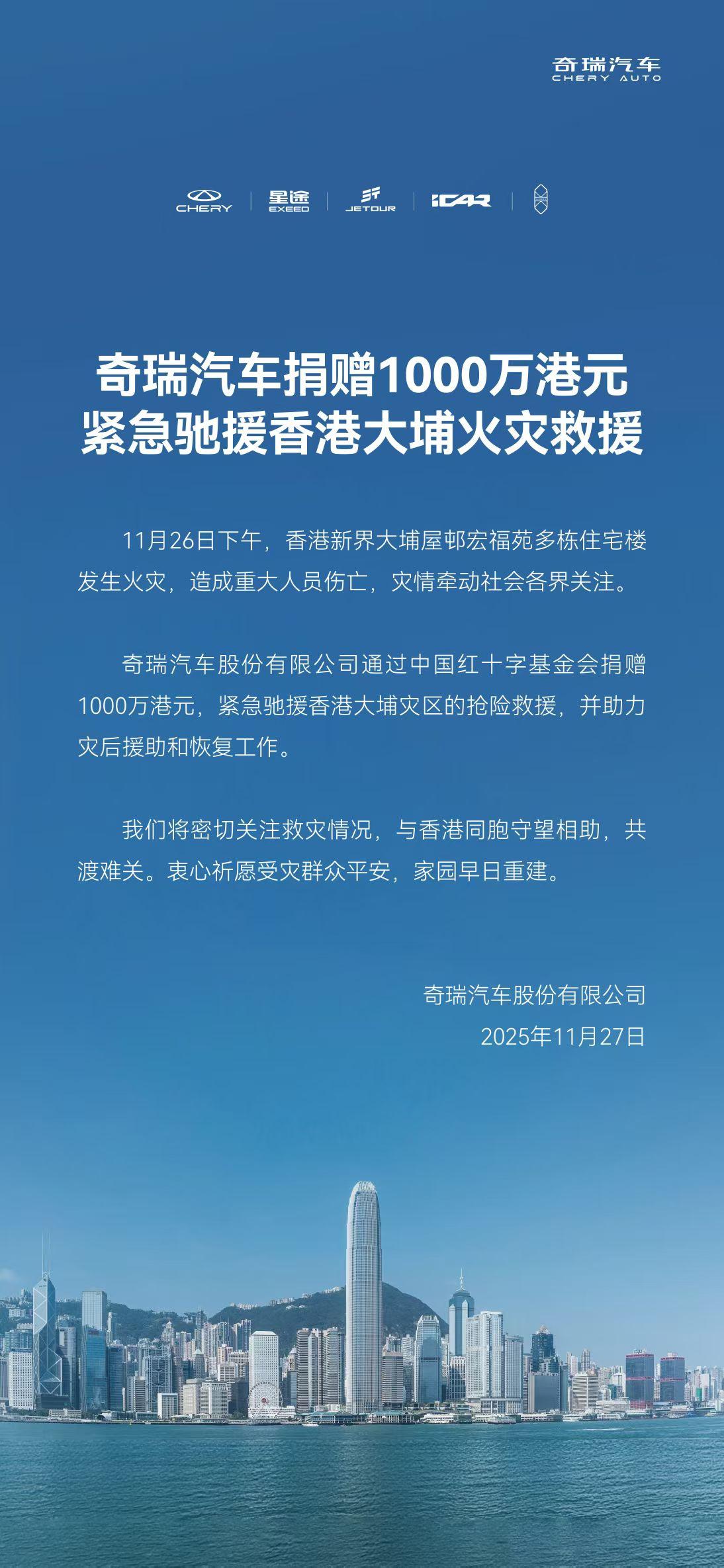 比亚迪、奇瑞汽车都为香港大埔火灾捐了1千万港元进行救援、医疗、紧急安置及灾后重建