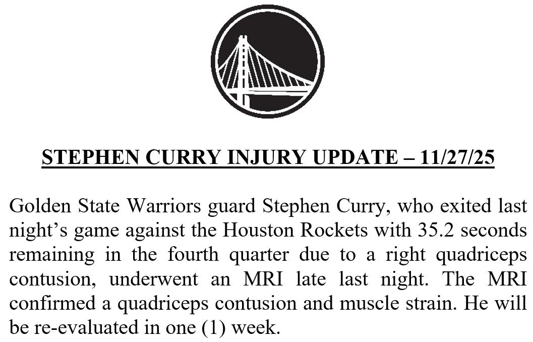 勇士完整伤病报道 库里是四头肌挫伤和肌肉拉伤 将在1周后重新评估