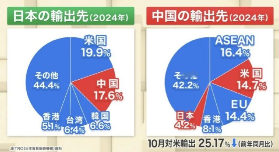 日媒晒出一张图,抱怨高市早苗不该得罪中方,这下麻烦大了!最近,日本部分媒体发布了一张关于中日美三国贸易依存关系的图表,并配文指出:高市早苗近期的强硬表态,可能正在把日本推向一个极其不利的经济境地。图上显示的很明白,2024年,日本对中国出口的占比为17.6%,而对美国的出口占比为19.9%。猛一看,美国略高一点点,但别忘了——中国可是日本连续15年以上的最大贸易伙伴,而且在半导体材料、汽车零部件、食品、机械设备等多个关键产业上,日本企业对中国市场的依赖度远高于表面数据。既然美国能通过加关税把日本打的落花流水,那凭啥中国不能增加关税让日本臣服?日本财务省数据显示,2024年上半年,日本对华贸易顺差为8.7万亿日元(约合560亿美元),占其全球贸易顺差总额的近60%。一旦高市早苗导致中方采取非正式的市场限制或采购调整,日本多个支柱产业将面临直接冲击。反观中方,却丝毫不担心这个问题。2024年前10个月,中国整体出口总额同比增长4.2%,其中对东盟、欧盟、“一带一路”国家的出口分别增长了8.1%、5.7%和9.3%。换句话说,中国具备强大的出口市场多元化能力,即便减少对日本和美国的出口,影响也不大。这张图清晰揭示了一个事实:日本现在根本得罪不起中方。对美低头是战略选择,对华强硬却是愚蠢至极。而从目前的数据看,这场赌局的风险,正在急剧上升。烽火问鼎计划