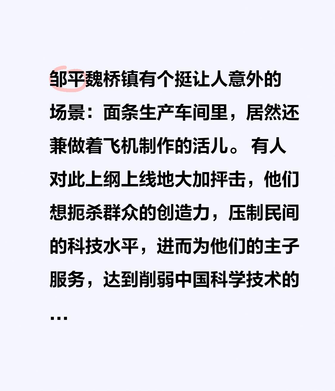 邹平魏桥镇有个挺让人意外的场景:面条生产车间里,居然还兼做着飞机制作的活儿。 有人对此上纲上线地大加抨击,他们想扼杀群众的创造力,压制民间的科技水平,进而为他们的主子服务,达到削弱中国科学技术的目的。 邹平见闻 魏桥镇 民间创造邹平 邹平飞机 邹平造飞机 邹平加工厂 邹平无人机 邹平市焦桥镇 邹平小面 邹平交流会 淄博邹平 邹平魏桥飞机 邹平魏桥美食 邹平面条厂 魏桥面条厂 邹平魏桥生活区 邹平西董店