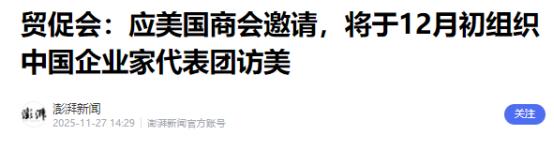 妥了!美国邀请中国出访 11月27日,中国贸促会举行11月例行新闻发布会,新闻发言人杨帆介绍:应美国商会邀请,将于12月初组织中国企业家代表团访问美国。 这次随行的企业覆盖面特别广,农业食品、机械电子、金融服务这些关键领域都有代表。他们不光要和美国政商各界坐下来聊,还会牵头办好几场中美工商界的交流活动。 美国商会这回的邀请,可不是空喊口号。熟悉情况的人都知道,这是一场有来有往的务实互动。 就在今年7月,美中贸易全国委员会刚带着苹果、波音、高盛这些美国大公司的高管访华,当时何立峰副总理和王毅外长都见了他们。现在中国企业家组团过去,算是一次实打实的回访。 最有意思的是农业食品领域的企业,他们这趟去身后跟着刚落地的大订单。11月下旬,美国农业部接连确认,中国三天内就买了160万吨美国大豆,这可是两年来单周最大的采购量。两艘满载订单的货轮已经开赴美国港口,还有一艘货轮正往得州运高粱,中断半年的农产品贸易通道彻底通了。 这些农业企业代表心里都有本账,中国每年要进口一亿多吨大豆,自己产的只够满足15%的需求,美国大豆在供应稳定性上一直有优势。 而对美国豆农来说,中国市场更是不能丢——2024年美国大豆出口里,一半以上的订单都来自中国。这回面对面交流,就是要把这种互补的合作盘得更稳。 机械电子领域的企业则带着更具体的诉求,贸促会的贸法通平台有组数据,最近企业咨询里,美国是提到最多的目的国,贸易纠纷和合规问题的咨询量一直居高不下。这些企业想去美国,就是要跟当地合作伙伴把标准对接清楚,把合作里的堵点当面解开。 就在这个月,贸促会刚和美国驻华使馆一起办了中美医疗与保险行业圆桌会。不少美国企业在华拓展业务,都需要金融服务跟上;中国企业去美国投资,也得有靠谱的金融支持。这些实际需求,都得靠双方坐下来慢慢谈。 任鸿斌会长会亲自带队,这个规格不低。这也是三中全会之后,首个访美的中国工商界代表团。他们身上带着明确的任务,要把中国高质量发展和高水平对外开放的新举措讲清楚,也想听听美国企业的真实想法。 这种双向奔赴的背后,是中美经贸谁也离不开谁的现实。2024年中美双边货物贸易额达到6882.8亿美元,就算有各种杂音,这个数字也没掉下来。美国商会的报告更直接,53%的在华美资企业都计划继续增加在华投资。 有些美国政客还在喊“脱钩”的调子,可企业早就用脚投了票。美国大豆协会的负责人最近松了口气,他们盼中国订单盼了大半年。中国的机械企业也需要美国的高端技术,这种互补性不是谁喊几句口号就能切断的。 代表团出发前,中美工商界的互动已经热起来了。这个月刚办完2025健康经济与创新发展对话会,接下来还要搞中美餐饮行业合作交流会。企业的参与热情特别高,大家都明白,稳得住合作,才能各自发展好。 12月初的美国之行,不会是走形式。农业企业要敲定更多采购细节,机械企业要谈技术合作,金融企业要搭起服务桥梁。这些实打实的交流,比任何空洞的声明都管用。 中美经贸关系的冷暖,最终要看企业的感受。中国企业家带着诚意过去,美国企业捧着需求过来,这种相互成就的合作,才是最靠谱的“压舱石”。毕竟生意要做长久,还是得面对面把话讲透,把合作落地。