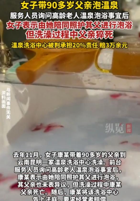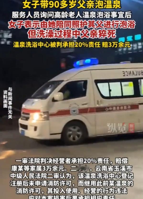 云南昆明,女子带90多岁的父亲到温泉洗浴中心泡澡,买票前,女子明确表示,她会全程陪同并照顾父亲。谁知,进去没多久,老人就出意外,尽管工作人员第一时间拨打了急救电话,但老人还是不幸去世。女子认为,父亲的悲剧洗浴中心应该负责,便将店家告上法庭,要求赔偿。洗浴中心觉得很冤枉,但法院的判决让人意外。 昆明城郊那家温泉洗浴中心的李老板,最近总在店里盯着墙上的消防许可证发呆。 去年冬天那场意外留下的委屈,至今还堵在他心里,客人是正常猝死,店里提前预警了风险,急救也没耽误,就因为许可证是前店主留下的没换新,怎么就落了个担责赔钱的下场? 2024年11月23号的一个午后,店里进来了一对特殊的客人。 一名中年中年女子扶着一位身形佝偻的老人,看老人的步态和神态,年纪显然不小了。 前台小姑娘赶紧上前询问,得知老人已经九十出头,立刻提高了警惕,告诉这名女子高龄泡浴的禁忌。 陪同的康女士听完后很笃定,说自己是特意带父亲来放松的,父亲平时身体还算硬朗,而且她会一刻不离地守着。 李老板刚好在前台对账,得到康女士反复保证后,才让收银员收了120元费用,安排服务员引着两人去了一个包间。 意外发生在半小时后,浴区突然传出急促的呼救声,正在附近巡检的两名员工立刻冲进去,只见老人已经瘫倒在池边,嘴唇发紫,失去了意识。 两人不敢耽搁,一人迅速将老人抬到旁边的休息床平卧,另一人马上跑去拿急救箱并拨打120,同时按照培训内容做心肺复苏。 李老板闻讯赶来时,消防柜旁已经围了几个帮忙的客人,急救器材都摆好了,大家都在盼着救护车快点到。 急救车十分钟就到了现场,医护人员接过后继续抢救了二十多分钟,最终还是遗憾地宣布了死亡。 随后辖区民警赶来,调取了浴区和走廊的监控,询问了康女士和现场员工,还查看了急救记录,最终出具的调查结论是排除外力伤害,属于心源性猝死。 李老板当时觉得,这场意外谁也不想发生,店里该做的都做到了,后续顶多是配合家属处理后事。 让他没想到的是,一个月后他收到了法院的应诉通知书。 康女士以“经营场所未提供安全环境”为由起诉,索赔包括死亡赔偿金在内的多项费用,总额超过十八万元。 李老板拿着起诉状愣了半天,翻出店里的风险提示照片、员工急救培训证书,怎么想都觉得自己没错,风险说了,救也救了,安全环境到底差在哪? 庭审时,李老板把准备好的证据一一提交,监控视频清晰显示康女士全程在老人身边,员工急救的动作也很规范。 可对方律师很快指出了关键问题,店里营业执照是李老板新办的,但墙上挂的消防许可证还是上一任经营者的,没有重新申请验收。 随后法院调取的勘验报告还显示,浴区通风系统的风速没达到温泉行业的安全标准。 这一点让李老板彻底懵了。他接手店铺时,前店主说消防证还在有效期内可以沿用,他也就没再多跑手续,而且店里每月都检查消防器材,从来没出过问题。 通风系统虽然没达标,但平时客人也没说过闷,怎么就和老人猝死联系起来了?他觉得这简直是牵强附会,哪有把意外死亡和证件问题绑在一起的道理。 法庭调查时,法官也认可了主要责任在死者一方。 九十岁高龄本身就是心脑血管疾病的高发群体,温泉池内高温高湿的环境会进一步增加心脏负担,老人作为完全民事行为能力人,应该清楚这种风险。 康女士作为陪同家属,虽然尽到了看护义务,但对高龄老人泡浴的风险评估不足,也有一定责任。 但法官同时强调,经营者的安全保障义务是全方位的,不只是事后急救。 按照《消防法》规定,公众聚集场所变更经营者后必须重新办理消防许可,这是保障经营安全的基础。 通风系统不达标也属于安全隐患,这些问题虽然不是猝死的直接原因,但说明经营环境存在缺陷,理应承担相应责任。 最终一审判决李老板承担20%的赔偿责任,共计3.6万余元。 李老板不服这个判决,当即提出上诉。 他觉得证件和设施的问题可以整改,但把意外死亡的责任算在这上面太不合理。 他请了律师重新梳理证据,可到了玉溪中院二审时,法院审查后认为一审认定的事实清楚,法律适用也没问题,最终驳回了上诉,维持原判。 这下不光李老板想不通,他那些开小饭馆、旅店的朋友也都议论纷纷,担心自己店里万一出事,会不会也因为类似问题担责。 律师跟他解释,法律对经营者的要求就是“底线不能破”,合规经营是安全保障的前提,哪怕风险没直接发生在不合规的地方,只要存在隐患就要担责。 李老板这才不情愿地交了赔偿款,紧接着就去办了新的消防许可,还把通风系统彻底换了。 只是每次想起这事,他还是忍不住叹气,明明尽全力救了人,最后却因为个证件问题受罚,这教训实在太窝心了。