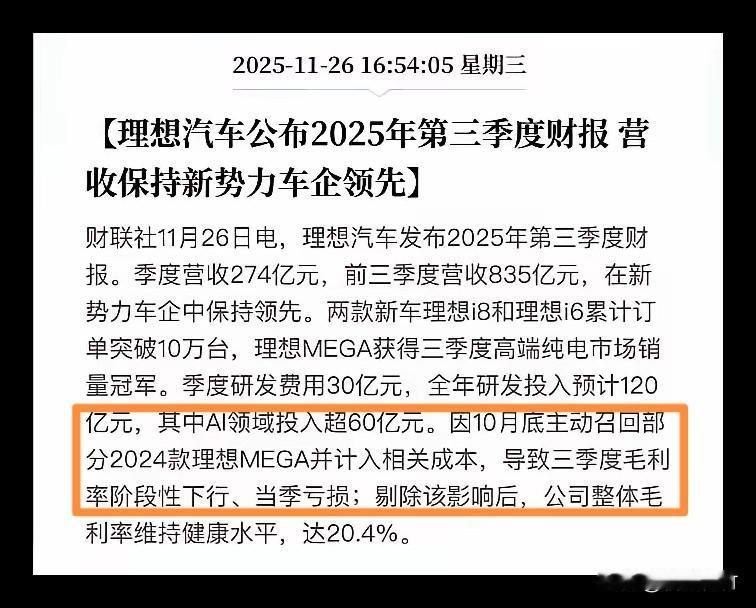 理想汽车三季度亏损!MEGA召回事件影响成主因! 一个负面事件影响有多大,看看理想就知道了,作为新势力盈利最早并且也是盈利状况最好的车企,受MEGA召回事件投入成本影响,理想汽车竟然第三季度亏损了。 销量下滑、因车辆质量问题召回等多重原因叠加影响,导致三季度毛利率下行,不过全年保持盈利应该是没什么问题的, 这是理想领先的地方,不像蔚来、小鹏还在为扭亏为盈而努力奋斗!