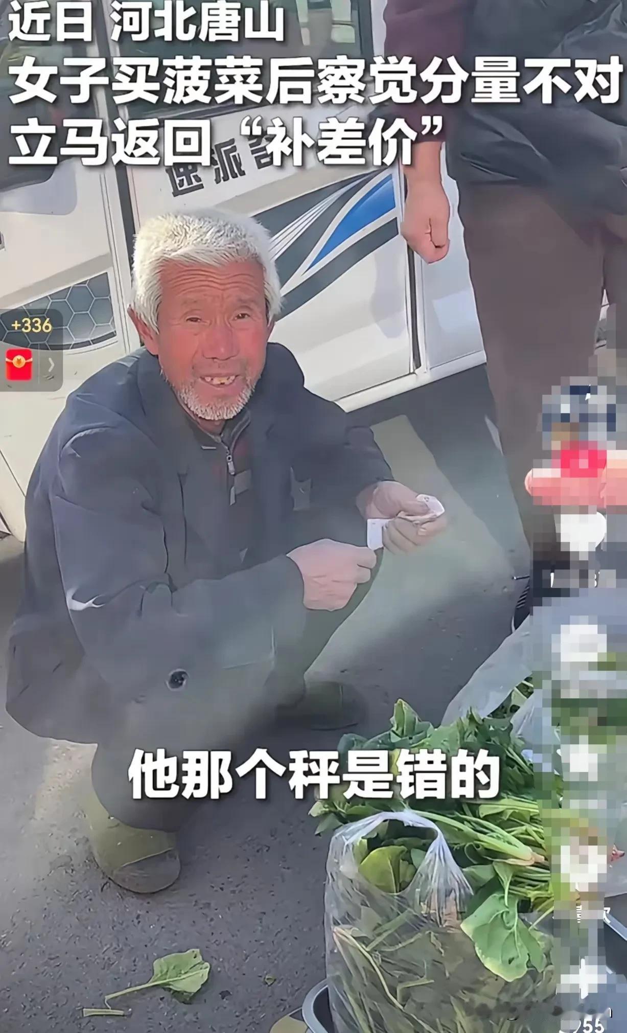 火到央视新闻了!近日,河北唐山的邵女子在一老爷爷的摊位上买了一斤菠菜,当老爷爷称完菜之后,就觉得不太对劲,一斤的菠菜怎么这么多呢? 抱着怀疑的态度,邵女士带着菠菜回了家,等她回家用自家的称称了称。果不其然,这哪里是一斤的菠菜,分明就是两斤。 邵女士攥着那袋沉得晃手的菠菜,没半点“占了便宜”的窃喜,反而皱起了眉。 她常绕路买路边摊的菜,知道这些蹲在街角卖菜的老人,大多是附近村里的,菜是天不亮就从自家地里薅的,叶子上还沾着露水,择的时候连蔫了的边都要掐干净,卖的价比小区菜店低了快一半。 刚才那袋菠菜,她提在手里坠得手腕发酸,哪是一斤的分量?多收的那一斤钱,说不定是老人早上买馒头的钱,或是攒着给孙辈买本子的零头。她没多耽搁,换了双平底鞋就往摊位跑,那袋菠菜揣在臂弯里,风一吹,菜叶子蹭着外套,凉丝丝的。 到摊位的时候,老爷爷还蹲在原地,旁边放着个掉了瓷的搪瓷缸,里面是半缸凉透的白开水,装菜的筐子破了个洞,用草绳缠了两圈。 他正低头理剩下的菠菜,指尖沾着泥,指甲缝里卡着点菜根的绿,连指关节都皱得像干了的树皮。看见邵女士折回来,他先慌了神,赶紧撑着膝盖站起来,腿晃了一下才稳住,手在深蓝色的外套衣角上使劲蹭:“姑娘,是菜不新鲜?我给你挑两把刚择的,叶儿都嫩着哩。” 邵女士把菠菜往他那台旧秤上一放,指着跳起来的秤砣说:“大爷,您这称指针锈了吧?刚才说一斤,这称显的是两斤,我得把多的钱补给您。” 老爷爷盯着秤看了好半天,眼睛凑得离指针只有几厘米,才拍了下大腿,声音都哑了:“嗨,这老称是我儿子十年前卖水果用的,去年指针就锈住半截,我眼神花,刚才瞅着针在一斤那儿,没承想偏了半截。” 他接过邵女士递过来的零钱——是两张皱巴巴的一块和几个钢镚,攥在手里的时候,指节都紧得发白,又往邵女士的袋子里塞了两把带着根的菠菜:“姑娘你是实诚人,这菜不值钱,你拿着吃。” 邵女士把菜推回筐里,笑着摆了摆手:“够了够了,您这菜新鲜,我今晚炒着吃正合适,下次还来您这儿买。”老爷爷搓着手,嘴角咧开,露出几颗缺了的牙,看着邵女士走远,还朝着她的背影喊:“姑娘,明天我带点萝卜,刚从地里拔的!” 没人逼着邵女士折返这一趟。毕竟多拿的一斤菠菜,撑死了值两三块钱,就算她装没看见,揣着菜回家炒了吃,也没人会说一句不是。 可她偏要跑这一路,不是为了落个“好人”的名声,是她看见老爷爷蹲在风里理菜的样子,想起了老家种地的爷爷——每回卖菜都要在村口等大半天,遇着砍价的,连五毛钱都要让出去,菜卖不完就挎着筐挨家送,总说“烂了可惜”。她补的不是那几块钱的差价,是不想让老人的辛苦,折在一台锈了的秤上。 这事儿能火到央视新闻,不是因为多轰轰烈烈,是这袋沉过头的菠菜里,裹着最实在的“将心比心”。 现在不少人买东西,总盯着自己的得失:怕称少了亏,怕价高了冤,遇上“占了便宜”的事儿,第一反应是赶紧走,生怕对方反悔。可邵女士偏反过来,看见对方可能亏了,就急着把好处还回去。这种心思不是刻意装出来的,是看见别人的难,顺手就伸了把手。 老爷爷的称不准是无心之失,邵女士的折返是主动的善意,这两个普通人没说什么漂亮话,没做什么惊天事,就靠着一袋菠菜、几块零钱,把“体谅”这两个字,落在了实实在在的生活里。 不是所有的善意都要大张旗鼓,有时候多跑一趟路,多补几块钱,就是把别人的辛苦,真真切切放在了心上。 各位读者你们怎么看?欢迎在评论区讨论。