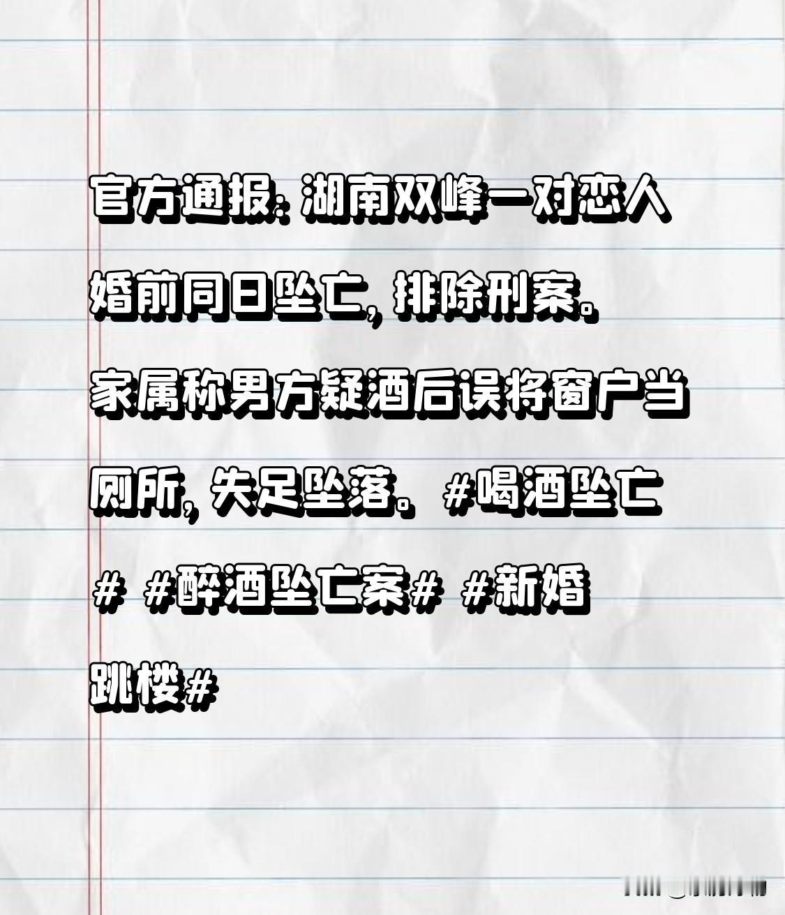 官方通报:湖南双峰一对恋人婚前同日坠亡,排除刑案。家属称男方疑酒后误将窗户当厕所,失足坠落。 喝酒坠亡 醉酒坠亡案 新婚跳楼