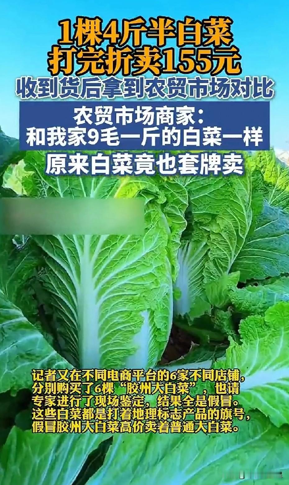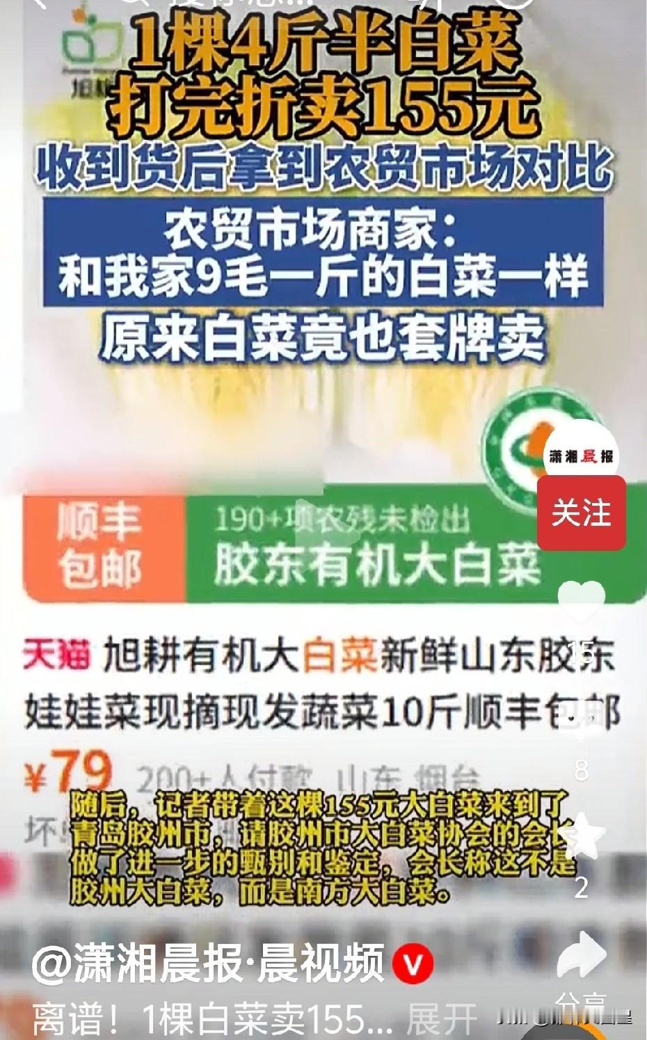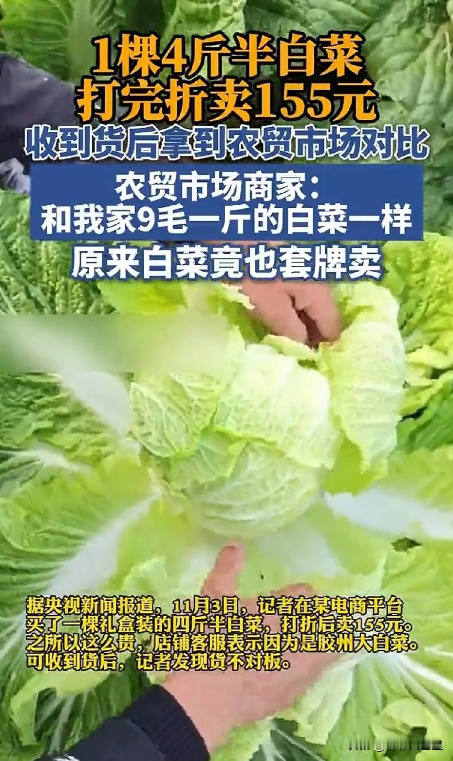 一棵白菜卖155元!这不是坑人吗? 有记者在网上某平台买了一棵标签为有机山东胶州礼盒白菜,重量4斤半,打完折还花了155元。记者怀疑自己买的白菜有假,拿到专家那儿鉴别竟然是冒牌菜,再拿到农贸菜市场与老农卖的白菜比较,结果一比较,两棵白菜没啥区别。 现在线上线下的商家真会坑人,一个普通大白菜一包装就卖100多,而还有些人就去买。到底是商家精呢?还是买家傻呢? 反正让我花100多元买一棵白菜我是不会买的!你会买吗?