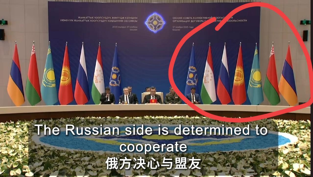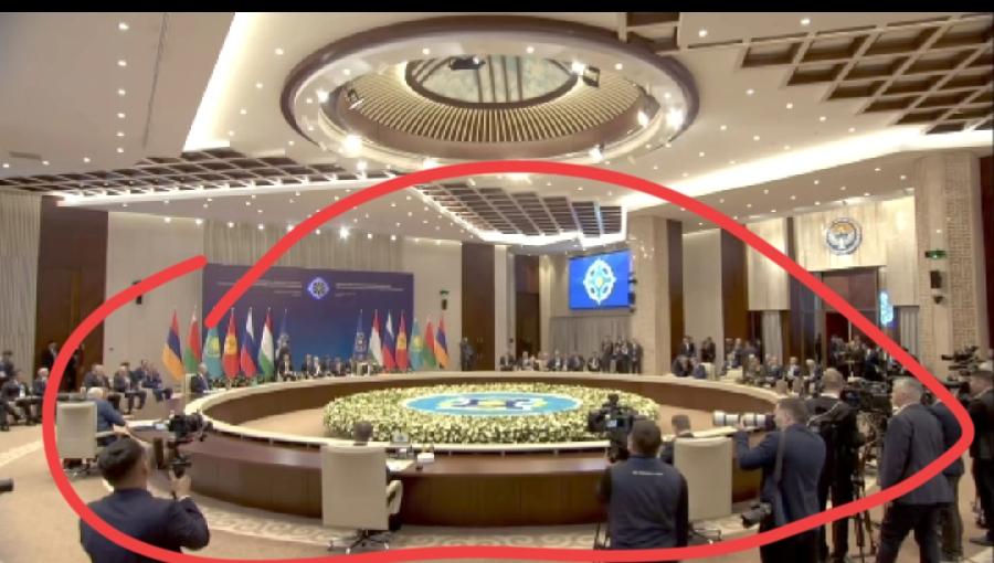 集安组织开会,会场布置3个细节: 1、就6个人,搞张超大圆桌,太疏远了吧? 2、背景摆了7国国旗,虽然亚美尼亚没来,宣布要退出,可是没正式退出! 3、会议用水,除了常规一瓶矿泉水,还有2瓶果汁饮料,很浓,像沙棘汁! 创建30年了,集安组织每年定期开会,作用很大!