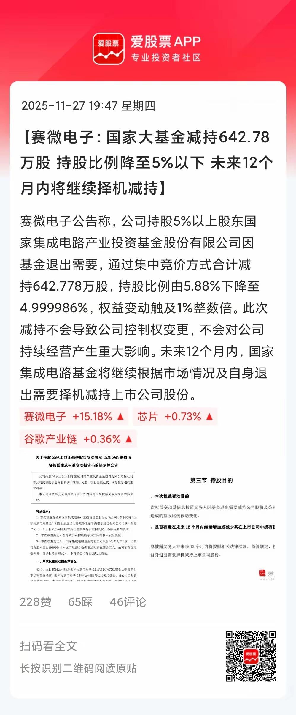 国家大基金挺会玩的,减持赛微电子642.778万股,套现小3个亿。更关键的是,减持后持股比例由5.88%下降至4.999986%,以后卖就不用公告了!赛微电子今年涨幅182%,是妥妥的大牛股!短短一个月从22块钱,到今天最高冲上50块了。资金这么热捧,国家大基金选择卖给大家,剩下近5%要全抛售的话,差不多能套现18亿元。A股科技股的问题,还是公司赚钱很难,但减持一点就是一大笔钱!这太考验人性了,股东肯定就想方设法减持了。