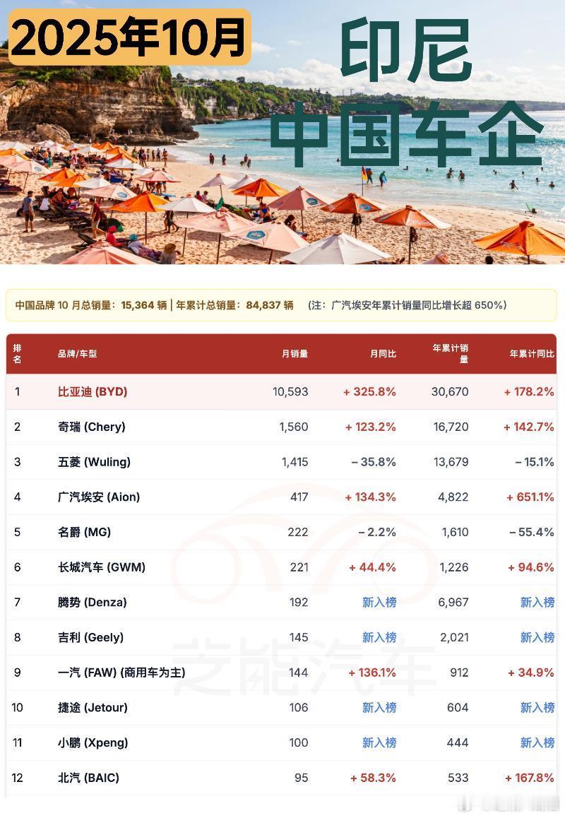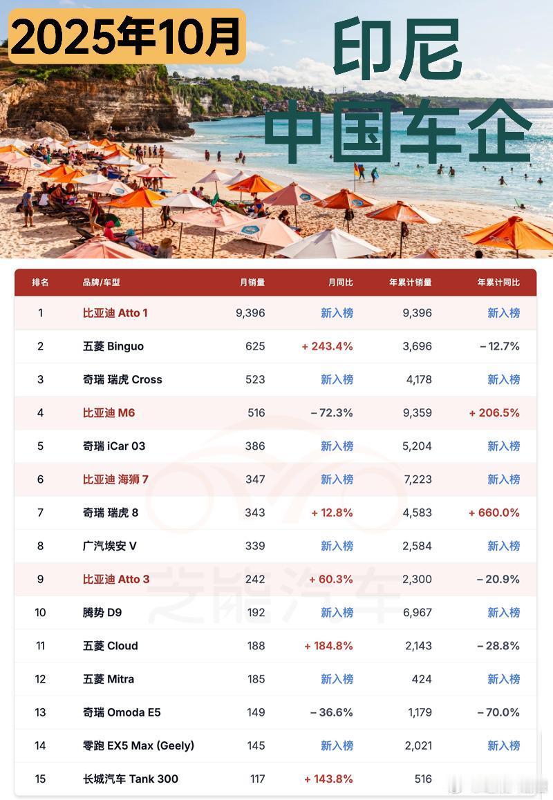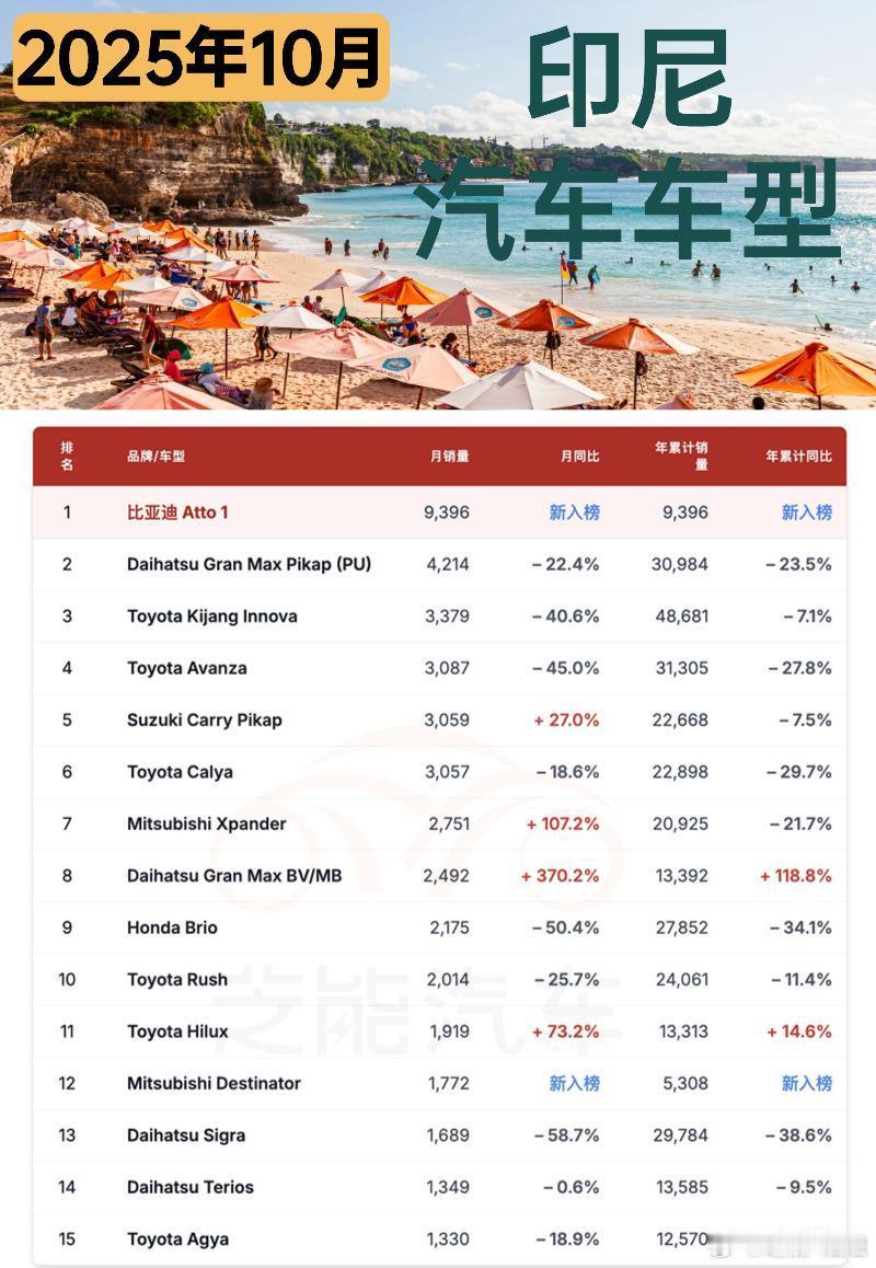 2025 年 10 月印尼车市整体下滑,累计销量也呈下降态势。中国品牌表现抢眼,比亚迪销量大涨跻身品牌前列,旗下车型还登顶销量榜。奇瑞等品牌紧随其后,腾势、吉利等新入榜品牌丰富布局。传统日系热销车型销量下滑,部分车型虽有增长,但中国品牌已成为印尼车市重要增长点~