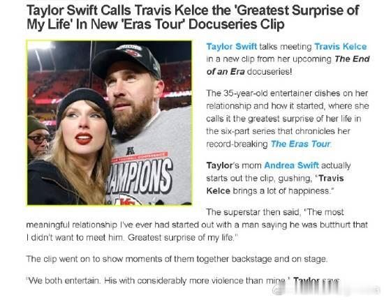 霉霉:Travis是我人生中最意想不到的惊喜霉霉在巡演纪录片里形容未婚夫Travis:“这是我人生中最有意义的一段感情,竟然是从他因为我不想见他而耿耿于怀开始的。这真是我人生中最意想不到的惊喜”。她还调侃称二人都是表演者,“只不过他的演出可比我的暴力多啦。”特拉维斯的追求方式被霉霉形容为“上世纪80年代电影剧情”:他因演唱会后台未能相见而耿耿于怀,随后带着友谊手链大胆表白,直接在她楼下喊出“我想和你约会!”("I wanna date you! Meet me, please!")。这种毫无保留的真诚,复刻了霉霉青年时期歌中憧憬的浪漫场景,让她感叹“最意想不到的惊喜竟始于他的执念”。
