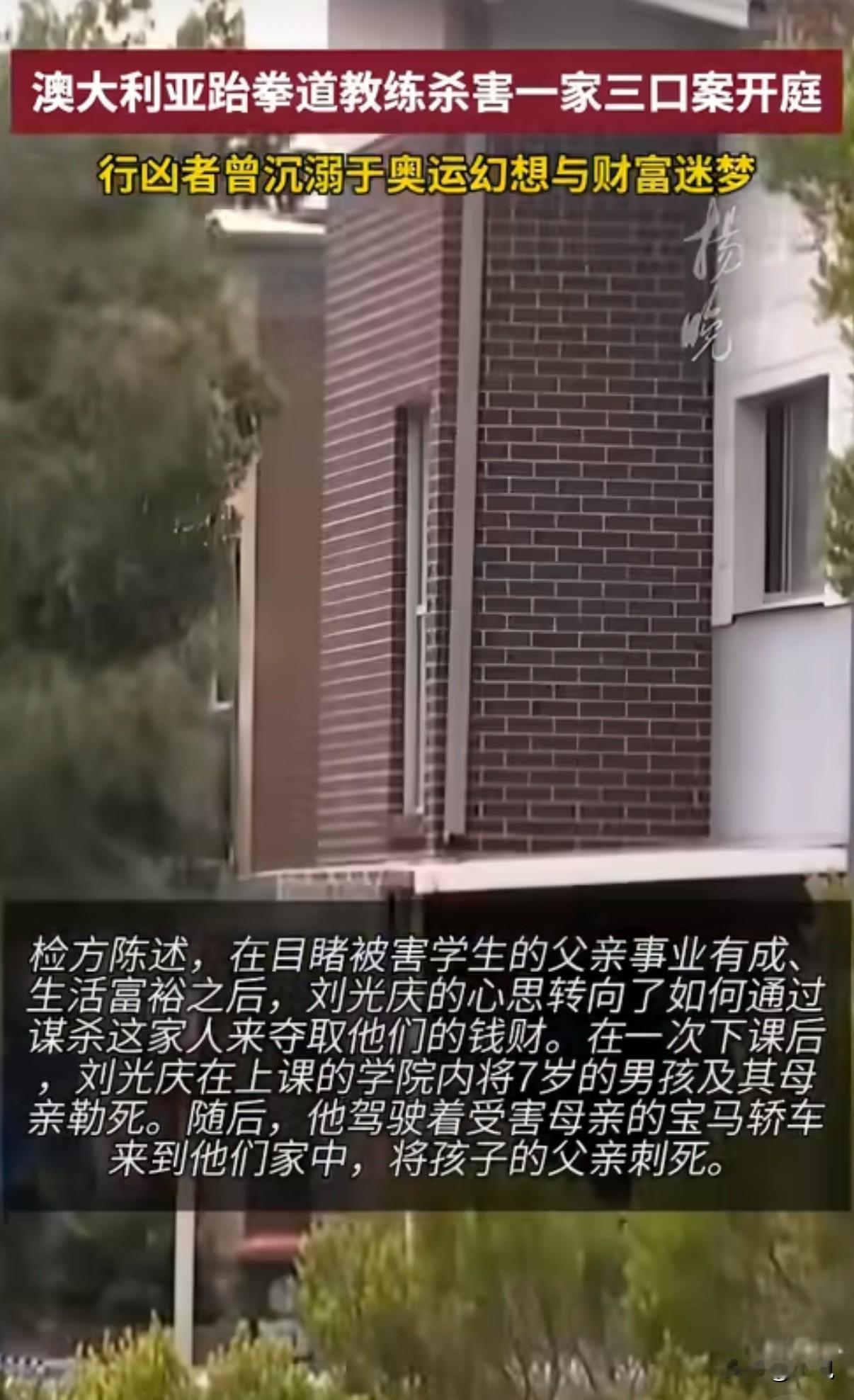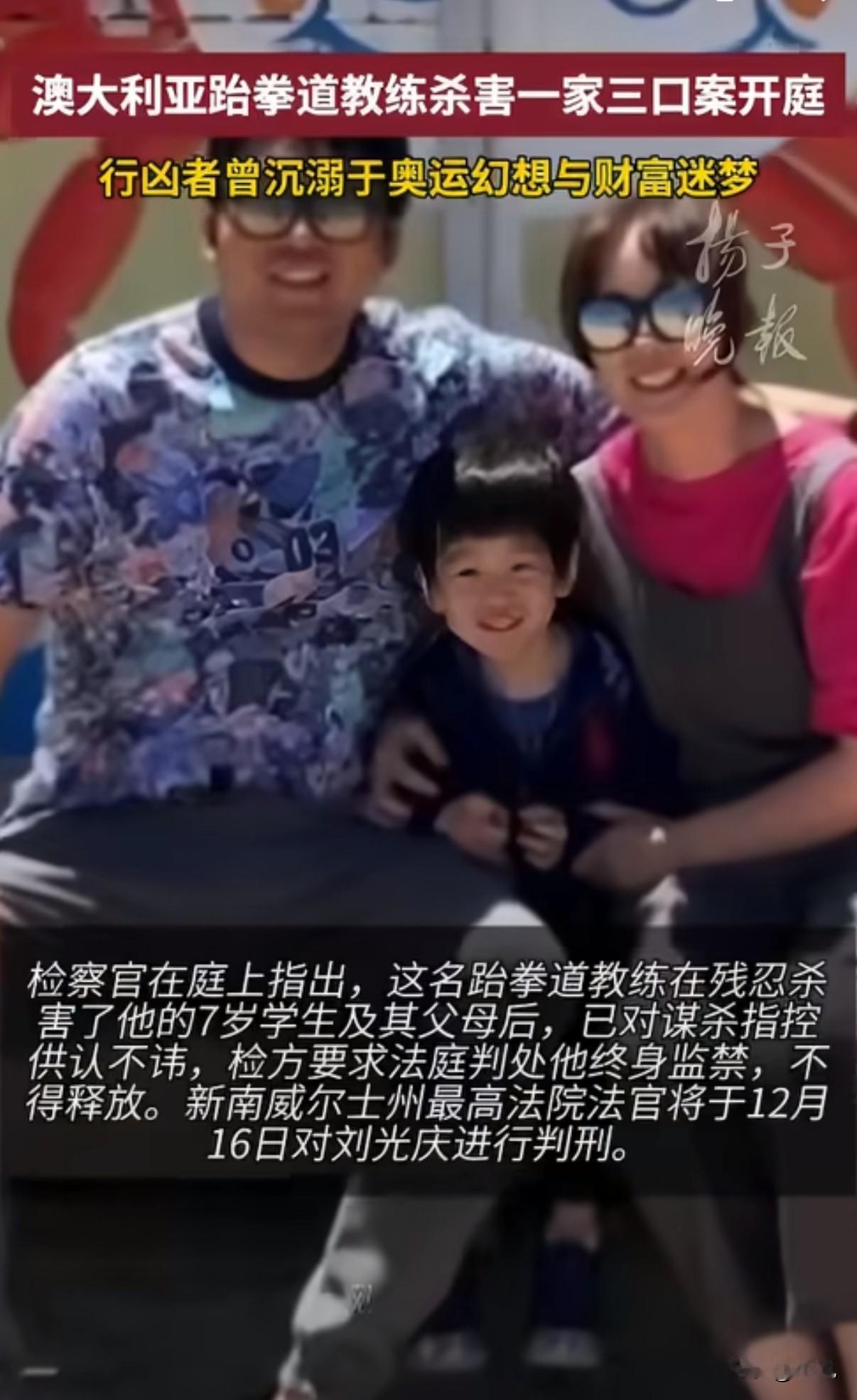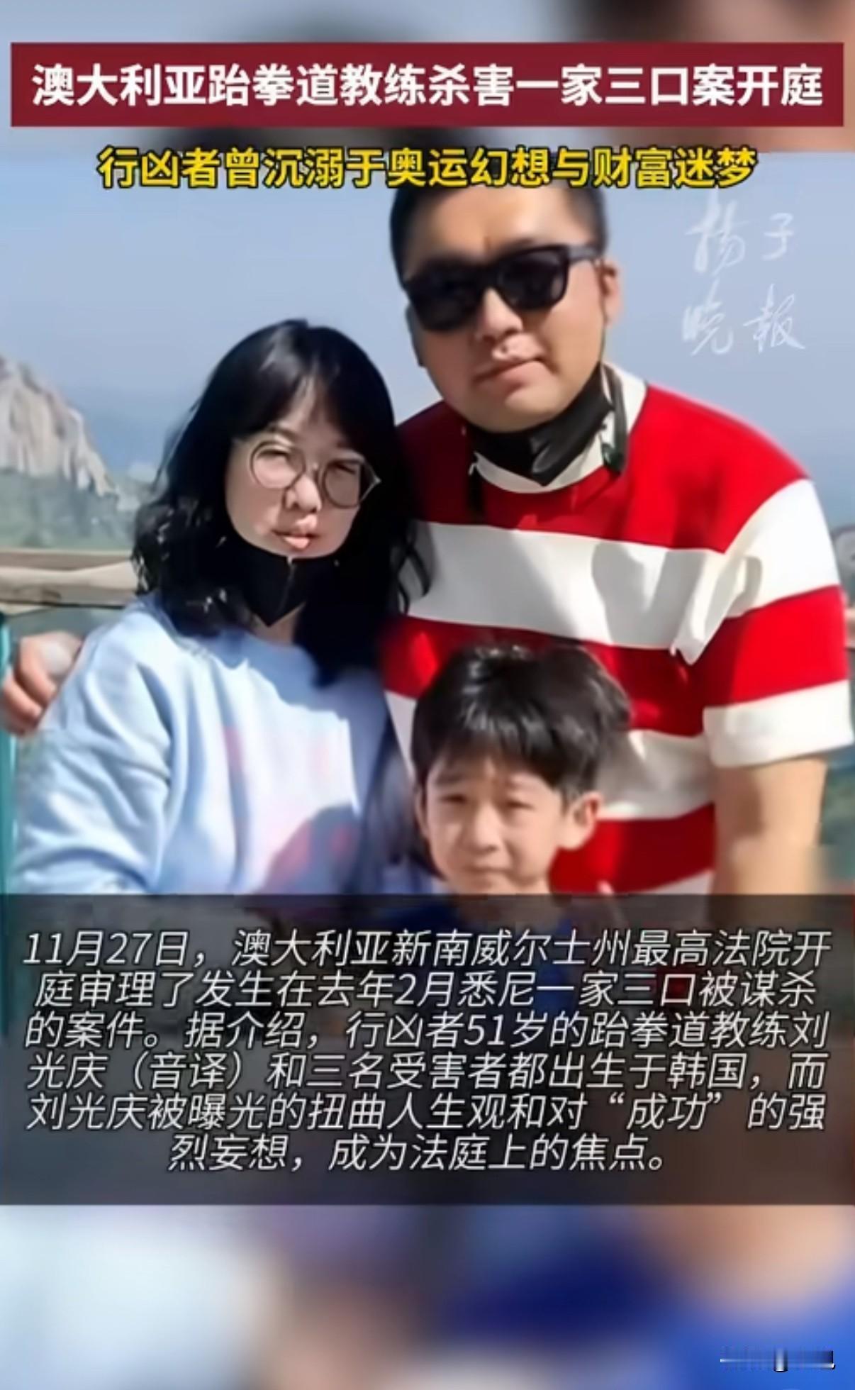 澳洲跆拳道教练杀害学生一家三口!只因嫉妒他们过得好 昨天,澳大利亚法院开庭审理了一起令人心碎的案子。一名51岁的跆拳道教练,亲手杀害了他7岁的学生和孩子的父母。 事情发生在去年2月。这名韩国裔教练刘光庆,在自己经营的跆拳道学院里,先是勒死了7岁的男孩和他41岁的母亲。然后他开着受害人家的车,找到孩子39岁的父亲,在家中将其刺死。 这起惨案的动机让人难以置信。检方披露,刘光庆长期生活在谎言中。他经常吹嘘自己认识澳洲首富,说要去参加奥运会,实际上却欠了一身债。 他教的这个7岁男孩家庭幸福,父亲事业有成。看着别人家的美满生活,对比自己的落魄,他心里越来越不平衡。 法庭上,法医精神病学家分析说,刘光庆有严重的自大妄想。他的辩护律师不承认是出于嫉妒,希望能从轻判决。 但检方态度坚决,要求判处终身监禁,永远不得释放。 受害者家属在法庭上哭诉:"我们的生命已经被完全摧毁了。普通的日常、微小的幸福、欢笑与交谈,全都消失了。" 一个本该教孩子防身术的教练,却成了伤害他们的人。这个案子最让人想不通的是,一个人的心理扭曲,怎么会走到这么极端的地步? 法院将在12月16日宣判。一个原本幸福的家庭就这样没了,留下的是亲人无尽的痛苦。 你觉得,这样的罪行应该受到怎样的惩罚?
