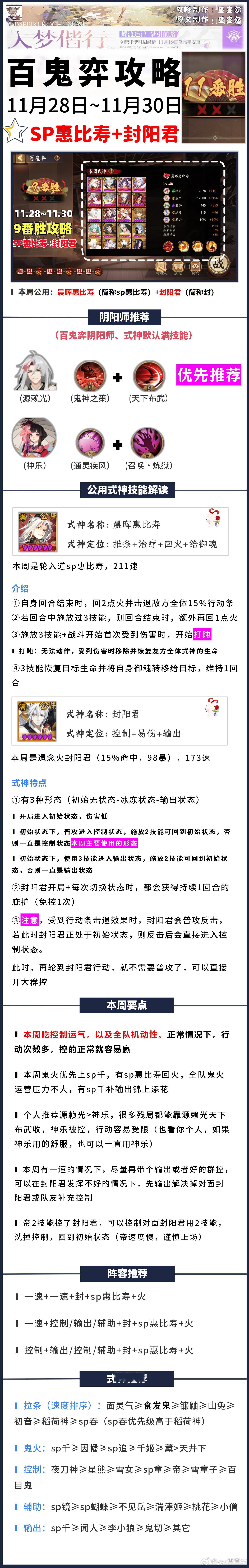 阴阳师手游超话创作官游戏百科 【百鬼弈】11.28~11.30,速刷九番保姆级攻略(sp惠比寿+封阳君)acg优创官 ■本周对局速度较快,机动性高+控的好是制胜关键■sp惠比寿回合结束时回2火/若开大,则回合结束回3火■封阳君靠对面推条封阳君反击或自己主动普攻,可进入控制形态