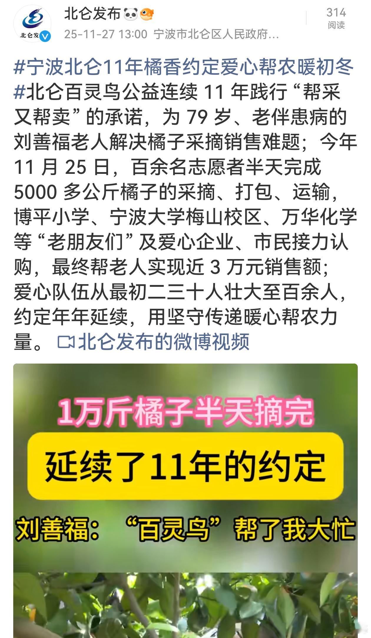宁波北仑11年橘香约定爱心帮农暖初冬北仑百灵鸟公益 11 年坚守帮采又帮卖,从寥寥二三十人到百余人的爱心队伍,见证了善举的感召力。志愿者们高效协作,众多单位、企业和市民踊跃接力,为老人解难题、增收入。这不仅是一次帮农行动,更是社会正能量的生动传递,让这个初冬暖意满满,期待这份爱心约定岁岁绵延。