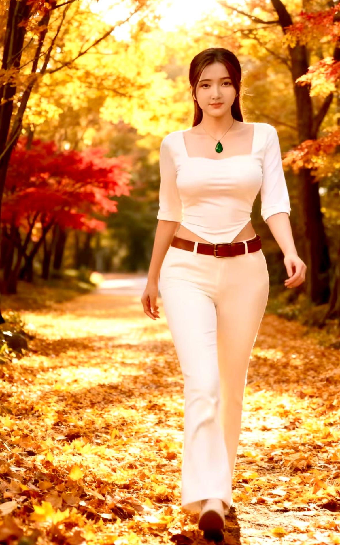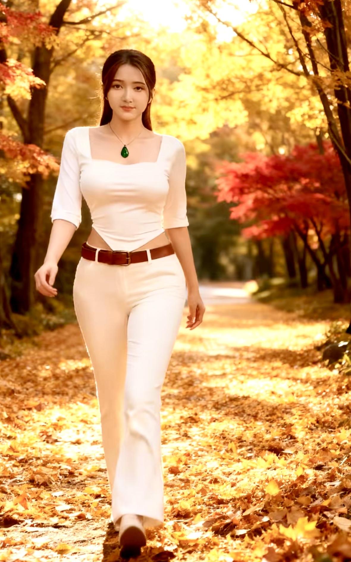 如何欣赏这张照片? 这张照片充满了浓郁的秋日氛围。画面主体是一位身着白色穿搭的女性,她穿着方领中袖上衣,搭配白色微喇裤,棕色腰带凸显腰线,颈间佩戴着一枚绿色吊坠,整体造型简约又不失精致。 她行走在一条铺满金黄落叶的林间小径上,两侧的树木叶片呈现出红、黄交织的斑斓色彩,阳光透过枝叶洒下,形成斑驳的光影,给整个场景增添了温暖而浪漫的质感,仿佛一幅秋日时尚写真,将自然之美与穿搭的优雅巧妙融合。 (文陈士健 图百度)