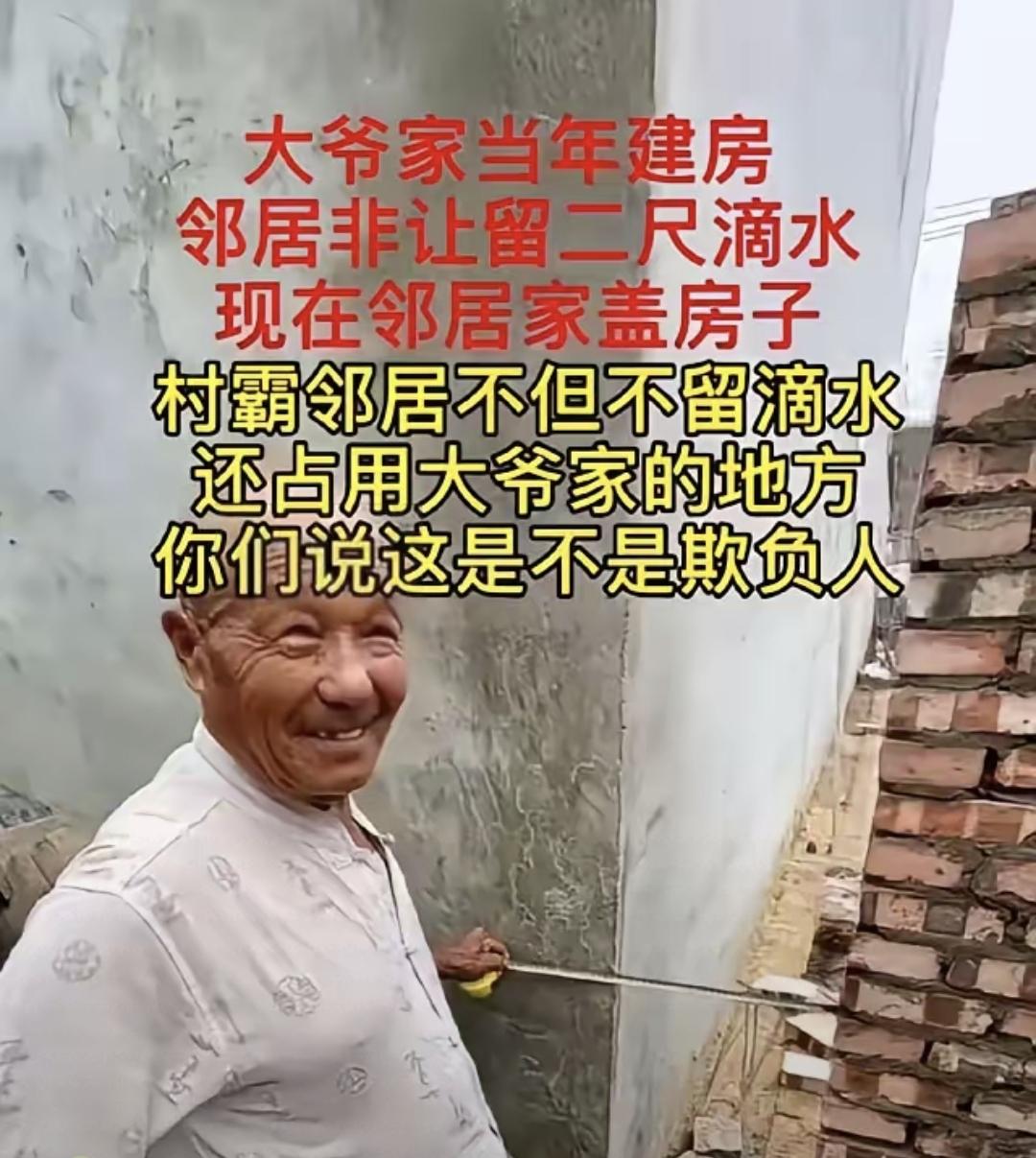 王大爷90年代盖房时和隔壁老李商量,特意留了两尺空地当排水道。老李当时夸他心眼好,说以后也不会扩建。去年老李家翻盖别墅,非但没留滴水空间,还把两尺地占了一尺,理由是现在都有下水道,没必要留空地。 村委会来调解,发现王大爷的地界证没写清楚具体距离,只能让两家人协商。老李说当年只是客气话,现在建房合规合法。王大爷气得直抹汗,说自己让地是做好事,没想着白送。 这事传遍村里,有人说老李不讲情面,也有人说王大爷早该把地界弄明白。现在两家房檐都挨着,下雨天还能听见两人在家门口吵架。