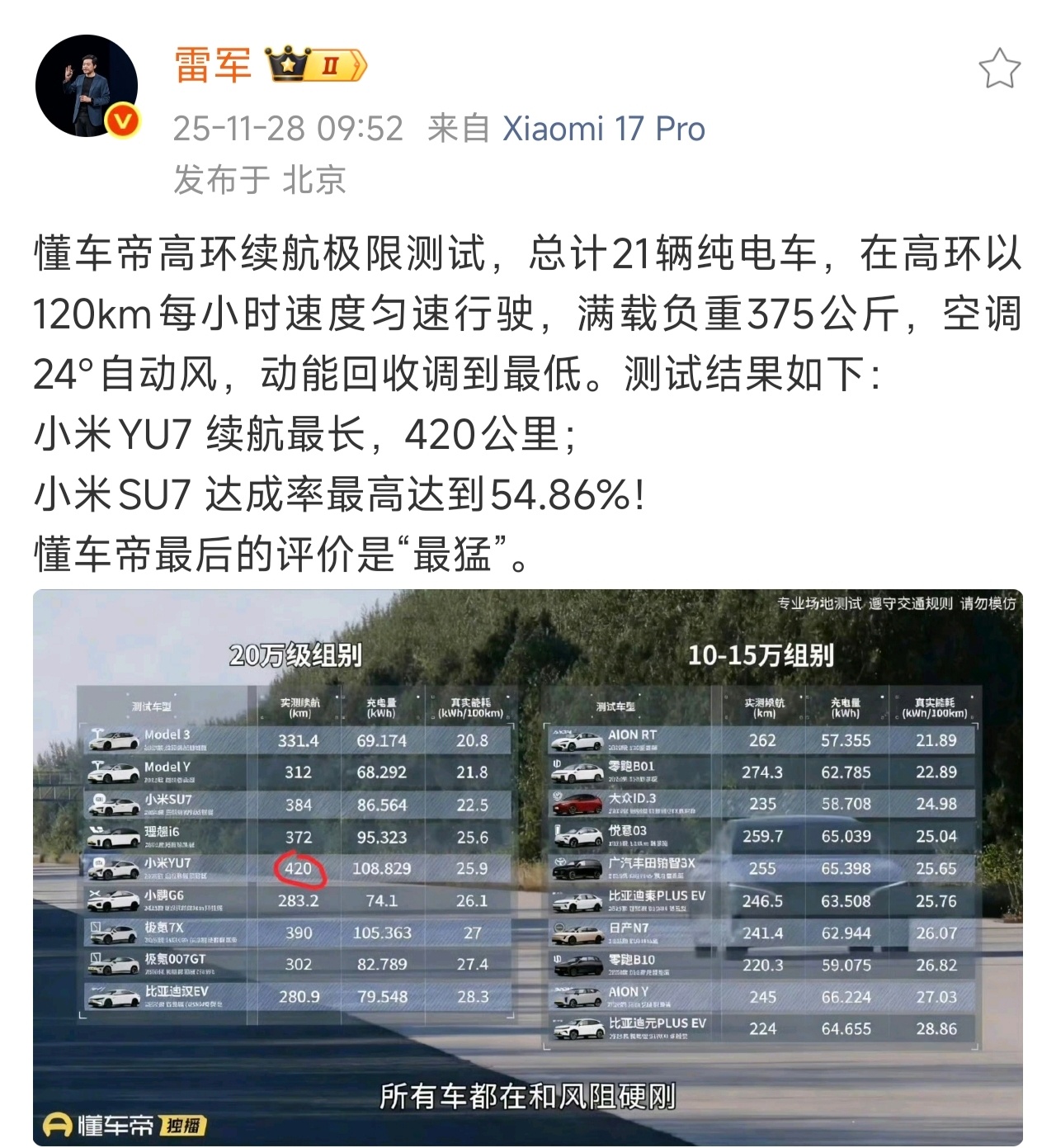 好家伙!小米YU7高速续航420公里。小米SU7高速续航达成率54.86%。注意!这是在高速以120km每小时的匀速行使!
