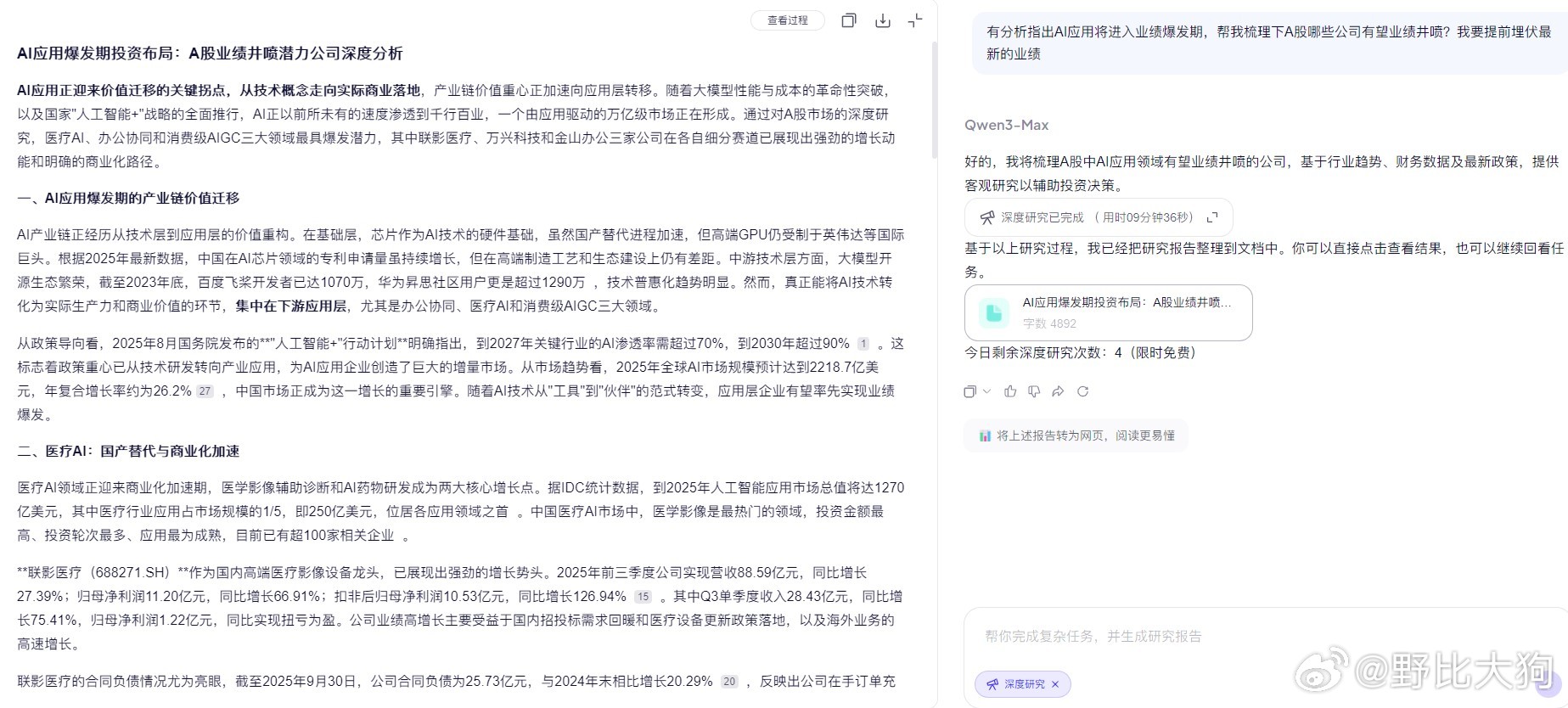 千问太猛了。。。我让它帮我梳理一下AI应用公司,那些即将进入业绩井喷期。直接给我写了一篇研报出来。