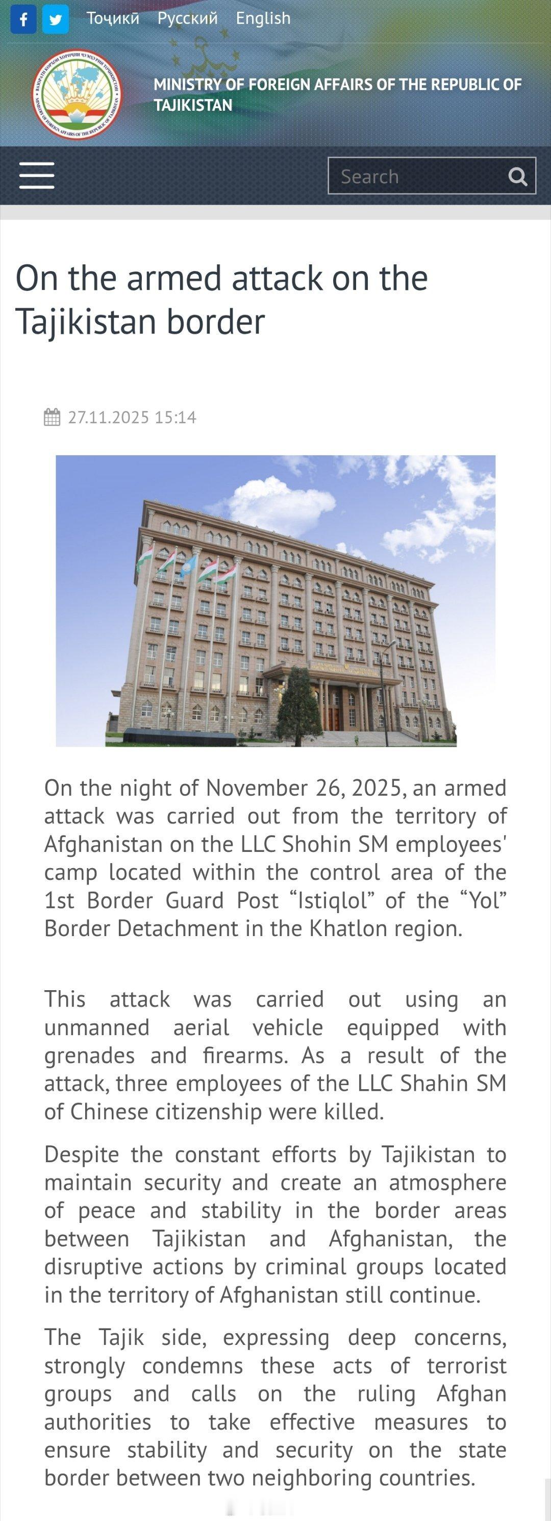 塔吉克斯坦称阿富汗跨境袭击致三名中国工人不幸身亡塔吉克斯坦外交部称,2025年11月26日夜间,一个位于阿富汗境内的武装团伙对“沙欣SM”有限责任公司的员工营地发动了武装袭击。该营地位于塔吉克斯坦哈特隆州“约尔”边防支队所辖的“伊斯蒂克洛尔”第一边防哨所的控制区域内。袭击者使用了枪支和装载手榴弹的无人机进行攻击,导致“沙欣SM”有限责任公司的三名中国籍员工不幸身亡。阿富汗尚未对塔吉克斯坦的指控作出回应。