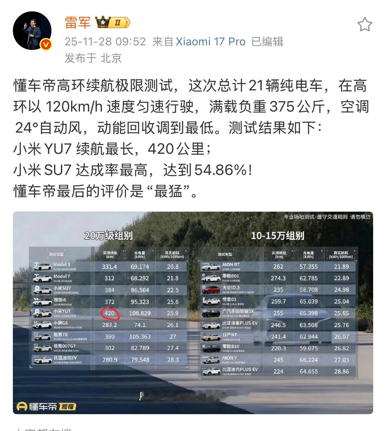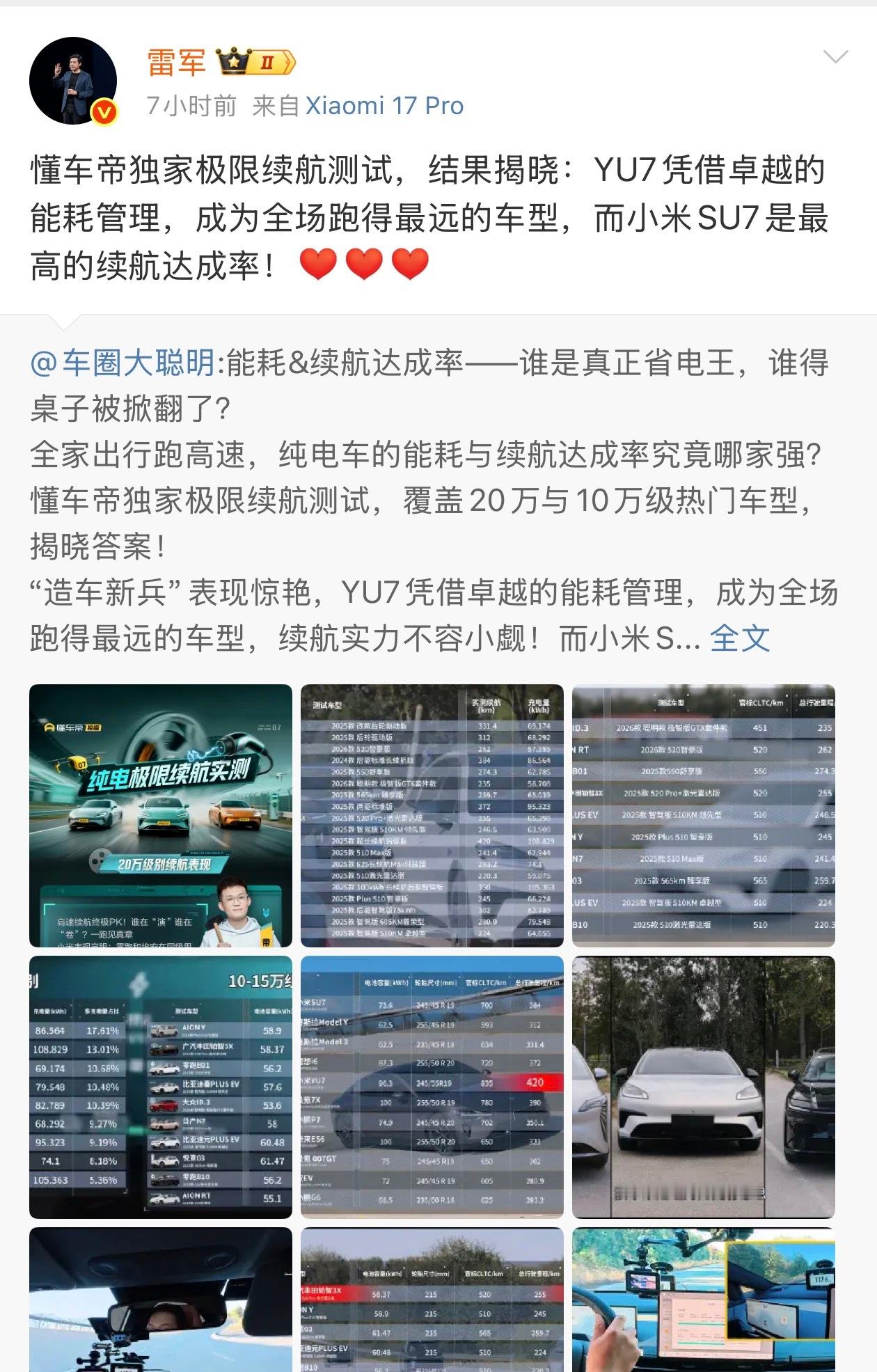 雷军回应小米汽车续航测试 懂车帝高环续航极限测试,高环以 120km/h 速度匀速行驶,满载负重375公斤,空调24°自动风,动能回收调到最低。YU7、SU7分别拿下续航第一和达成率第一,话说YU7这个续航确实可以,实打实的测试成绩,SUV能拿下这个表现,确实有点东西,小米在能耗管理上是下了功夫的,看了很多大媒体的评测,小米这两款车的成绩都还是在前列的,虽然是新车企,但是产品确实实打实扎实的干,有时候其实多看看几个大媒体的评测,多对比一下评测,大媒体大多都是专业且有规模,一定程度上能够让你更清楚了解产品,不至于被瞎带节奏。