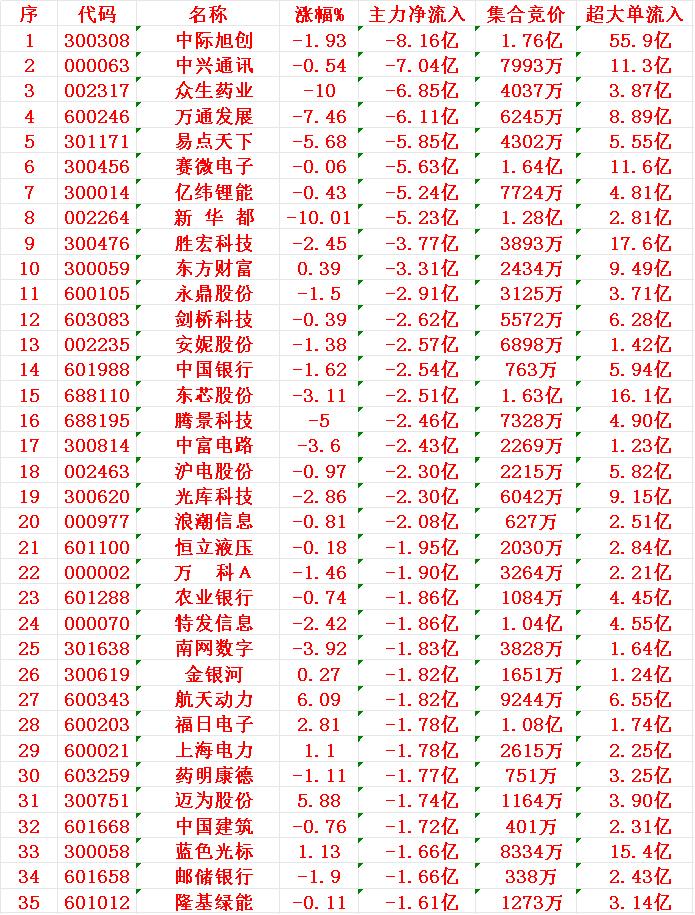 11月28日收盘,主力,已经大幅卖出的35名单: 中际旭创:净流入-8.16