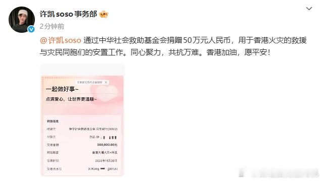 许凯为香港捐款许凯给香港捐款50万元 许凯为香港捐款,许凯给香港捐款50万元用于香港火灾的救援与灾民同胞们的安置工作。同心聚力,共抗万难。香港加油,愿平安!