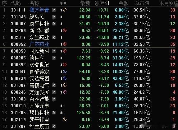 收评:今天A股跌幅榜,早盘0家跌停股,午后跌幅榜跌停股明显增加,这说明午后指数走高,但个股走弱。得付吧跌停股清一色近期高标强股,粤万年青止步2板大跌13CM,绿岛风昨天涨停今天大跌11CM,新华都止步4板,昨天10CM大面,今天跌停。众生药业跌停,广济药业止步4板跌停,昨天的空间板。国风新材连续2个跌停,真爱美家,欢瑞世纪,德科立,欢瑞世纪,实达集团,特一药业,万通发展等跌幅榜领跌股都是热门强股。对比跌幅榜,今天涨幅榜涨停股,海南,新疆,福建地图股,以及反之日本概念股。指数收涨,量能萎缩,高标股领跌,边缘股轮涨。今日看盘上证指数a股