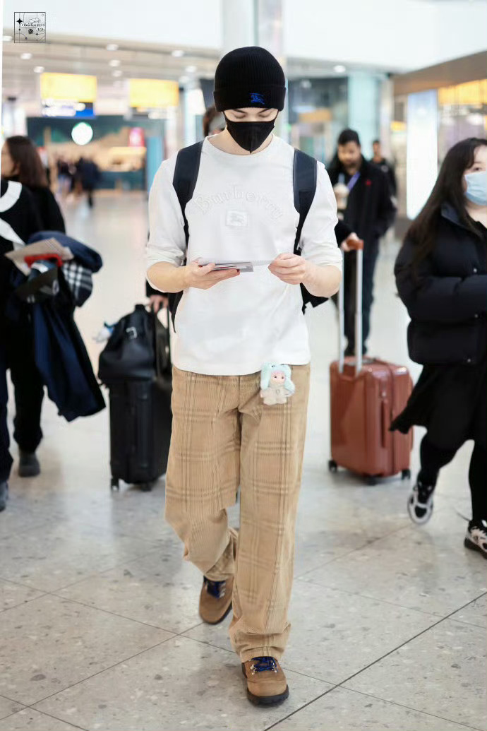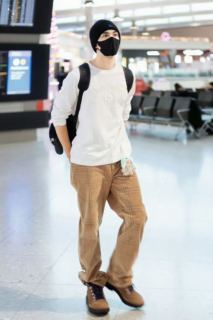 吴磊带wakuku走机场 伦敦机场出发look太戳!白色上衣+卡其色长裤清爽利落,帅感拉满~ 表面是高冷cool boy,裤子上藏着wakuku小细节,又帅又萌的反差感谁懂?!