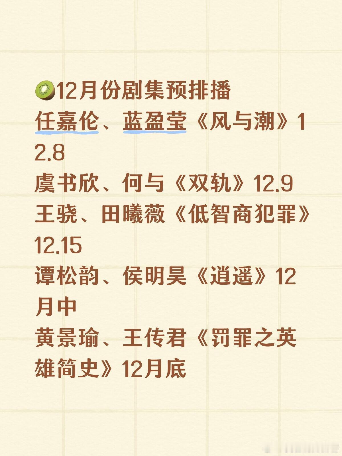 任嘉伦、蓝盈莹《风与潮》12.8虞书欣、何与《双轨》12.9王骁、田曦薇《低智商犯罪》12.15谭松韵、侯明昊《逍遥》12月中黄景瑜、王传君《罚罪之英雄简史》12月底