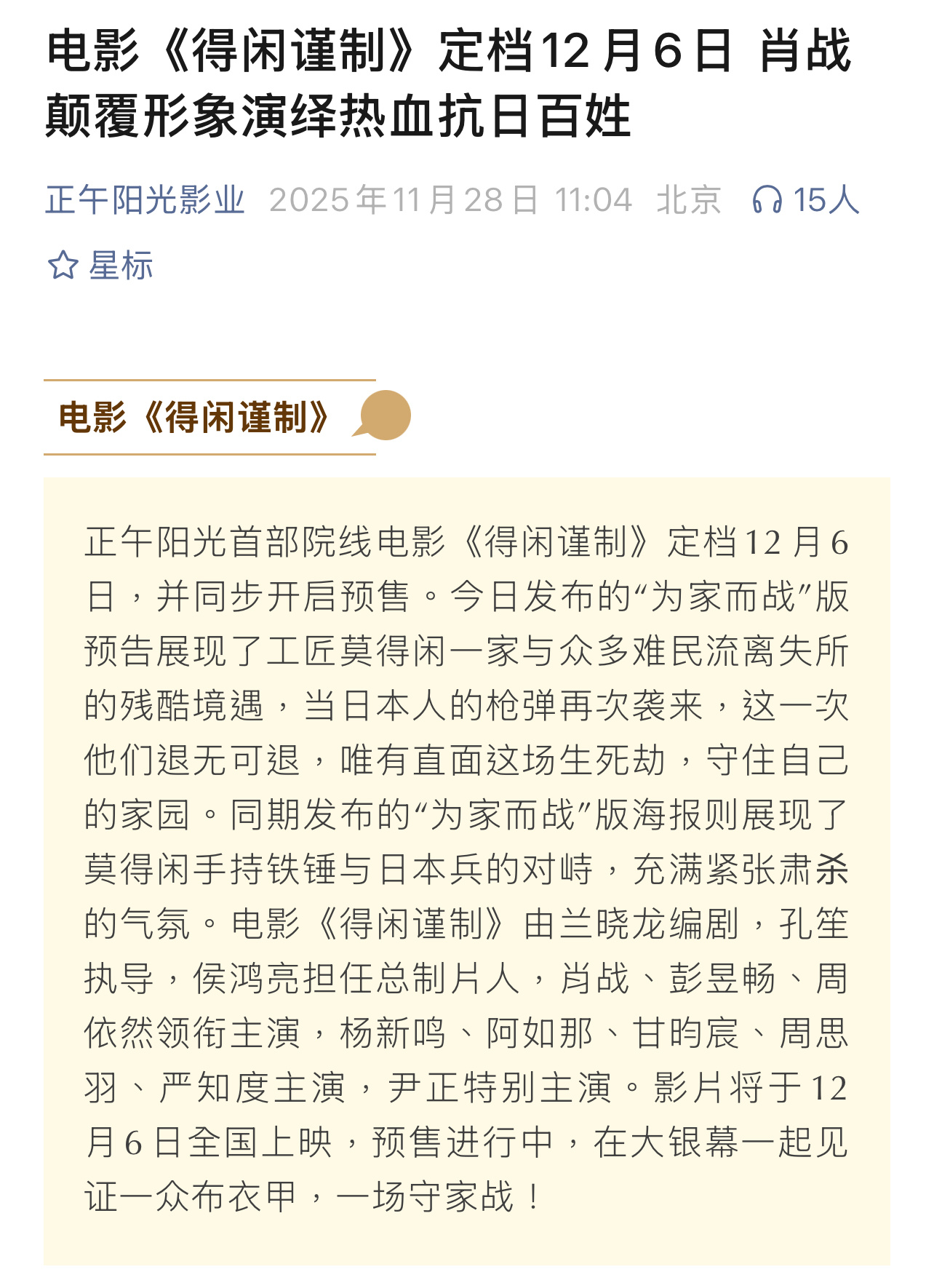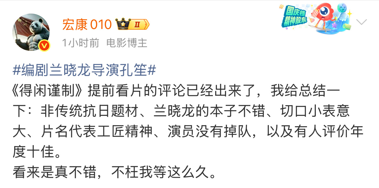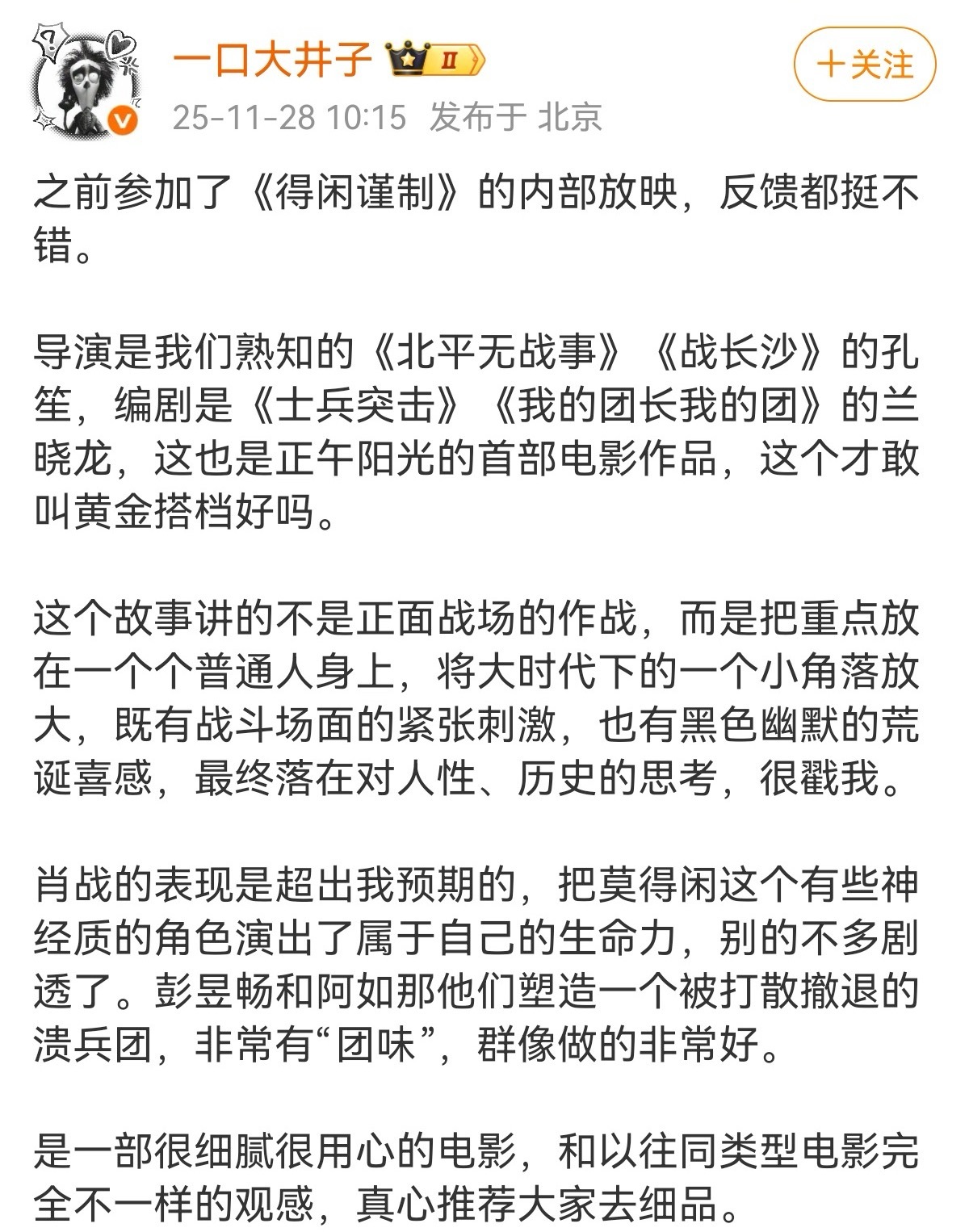 得闲谨制提前看片反馈肖战《得闲谨制》一批业内发了看片repo,在不剧透的情况下看得出反响不错,我还真的喜欢《我的团长我的团》这部剧,看来会很对我胃口