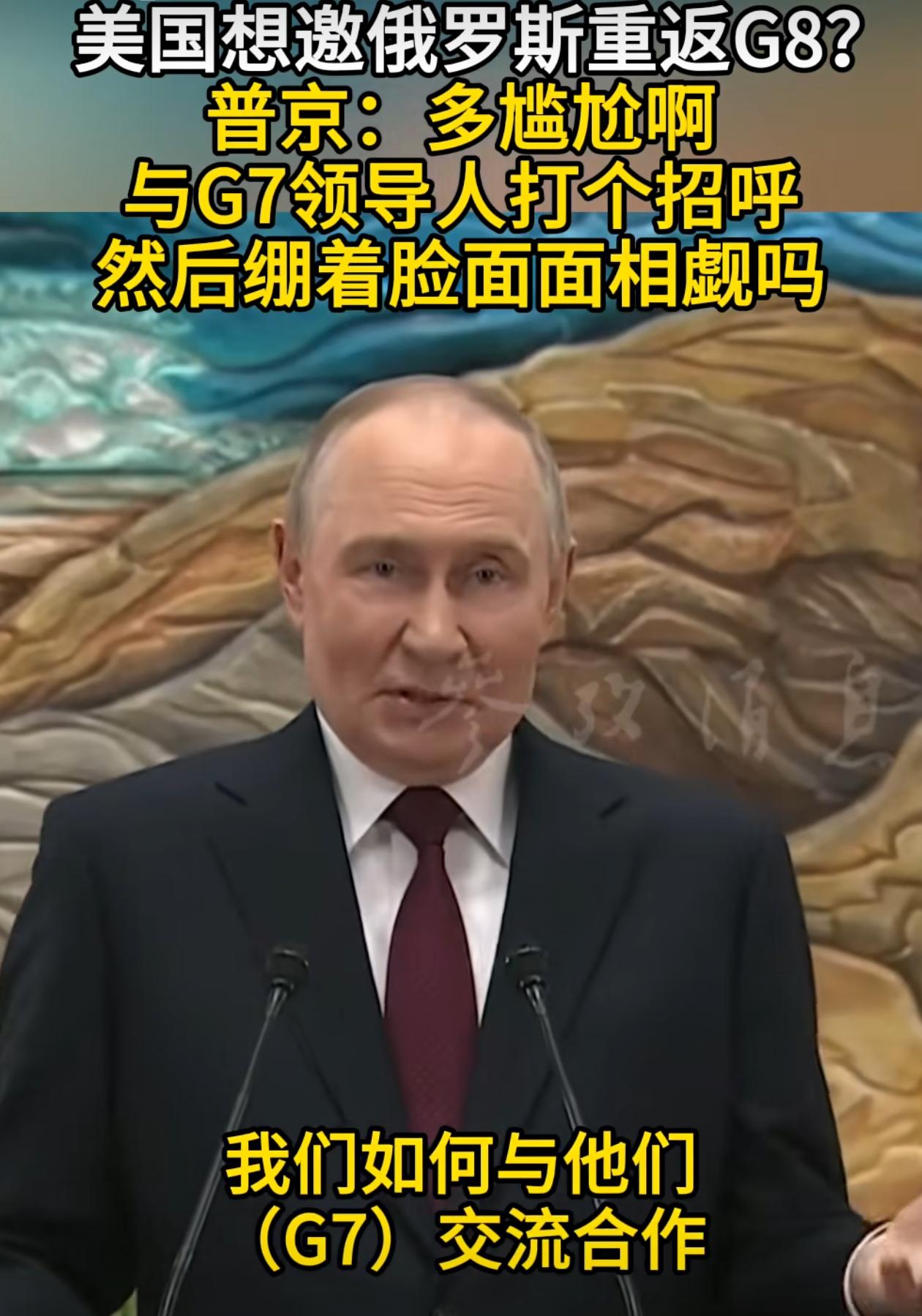 关于重返G8,普京给出回应! 据俄新社11月27日消息,俄罗斯总统普京在记者会上表示,“在这种情况下,我们如何与他们(G7成员国)对话和合作呢?见面后打个招呼,然后呢,难道要绷着脸面面相觑吗?这种情景是难以想象的!” 特朗普提出让俄罗斯重返西方,实际上只是他的一厢情愿罢了!其他几个国家在乌克兰战场都已经近乎直接下场了,要与俄罗斯搞个你死我活,怎么可能因为特朗普一句话和好如初,那是不现实的!普京说的没有错,现在的情景,俄罗斯绝不可能重返G8,而欧洲这几个G7国家也一定不会同意俄罗斯重返G8的。