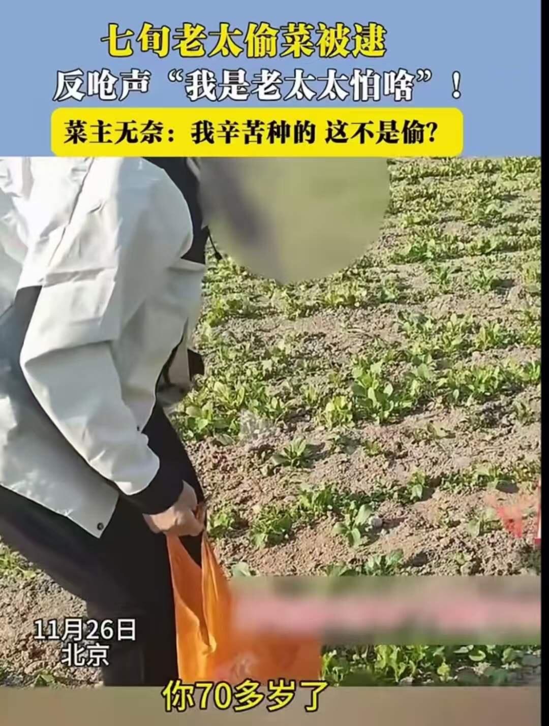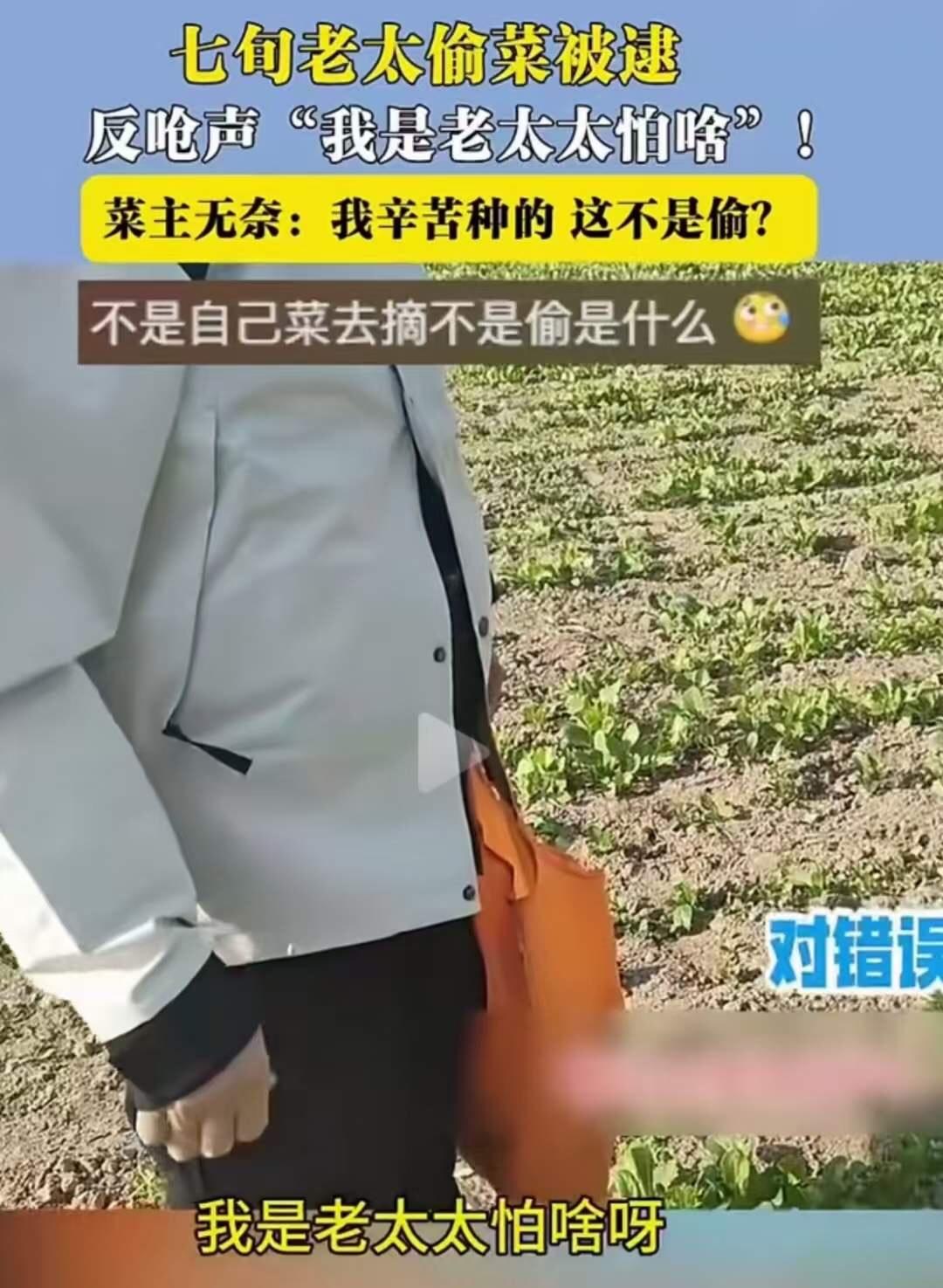 七旬老太太偷菜被逮,反而理直气壮地说:“我是老太太我怕啥?”菜农:“老就可以偷别人的东西吗?我们农民容易吗?” 这天,菜农像往常一样来到自家菜地,准备打理打理蔬菜。刚走到地头,就瞅见一个老太太在自家菜地里摘菜那袋子都快装满了。 这天,阳光正好,菜农像往常一样迈步到自家的菜地,准备给辛苦耕作的蔬菜们进行一次精心的整理。可是,刚走到地头,他的眼睛却被一幕让人震惊的场景吸引了——一位七旬老太太,正满载着自己“战利品”,站在菜地里,神情坦然。 起初,菜农愣了一下,心中既有些不解,也有些恼火。毕竟,菜地是自己辛苦耕耘的果实,怎么能让别人随意取走?但更让他震惊的是,老太太一边摘菜,一边还理直气壮地说:“我是老太太,我怕啥?”那种自信,仿佛所有的指责都被她轻松化解。 菜农皱起了眉头:“老就可以随便偷别人的菜吗?我们农民都不容易,辛苦一整年,才换来这些菜,你就这么随意拿走?”老太太听了,反而更加毫不在意,嘴角带着一抹淡然:“我活到这岁数,怕啥?我就想吃点菜,吃点自己喜欢的,谁都别管。” 这场争执,似乎折射出更深层次的社会矛盾:尊重与底线、老年人的权益与社会的规则、个人的“自由”与他人的“权益”。老太太的“理直气壮”,让人不禁思考:是不是在某些老年人心中,传统的“尊老”变成了一种特殊的“特权”?还是说,他们真的是在“为生活”而挣扎,才会如此“勇敢”地表达? 实际上,这起事件背后隐藏着一种普遍的社会现象:在快节奏、利益至上的现代社会,底线在哪里?尊重又在哪里?老人们的“胆子”变大,是否也反映出他们对社会规则的某种迷失?还是他们的行为,是对自己生活不易的一种无声抗争? 而我们每个人,都在这个社会的洪流中不断前行。有人会觉得老太太的行为令人不齿,有人则会觉得,她不过是为了生存而“奋争”。但更值得我们深思的是:当社会的边界变得模糊,价值观开始摇摆,我们是否也应该反省一下:如何在守住底线的同时,给予每个年龄段的人应有的尊重和关怀? 这场“偷菜事件”,看似平凡,却引发了社会对“尊重”“权益”“底线”的热烈讨论。也许,我们都应该学会用更宽容、更理性的眼光去看待那些“敢于突破”的人,毕竟,谁都有可能在某个阶段,成为那个“敢做敢为”的老太太。 愿每一个老人都能在社会温暖的怀抱中安享晚年,而我们,也都能在坚守底线的同时,看到生活中更多的善意与理解。毕竟,一个包容的社会,才是真正的温暖家园。大妈偷菜 大妈偷摘水果 偷菜老太太 菜园女偷 偷菜阿姨 小偷老太太 大妈偷摘桃子