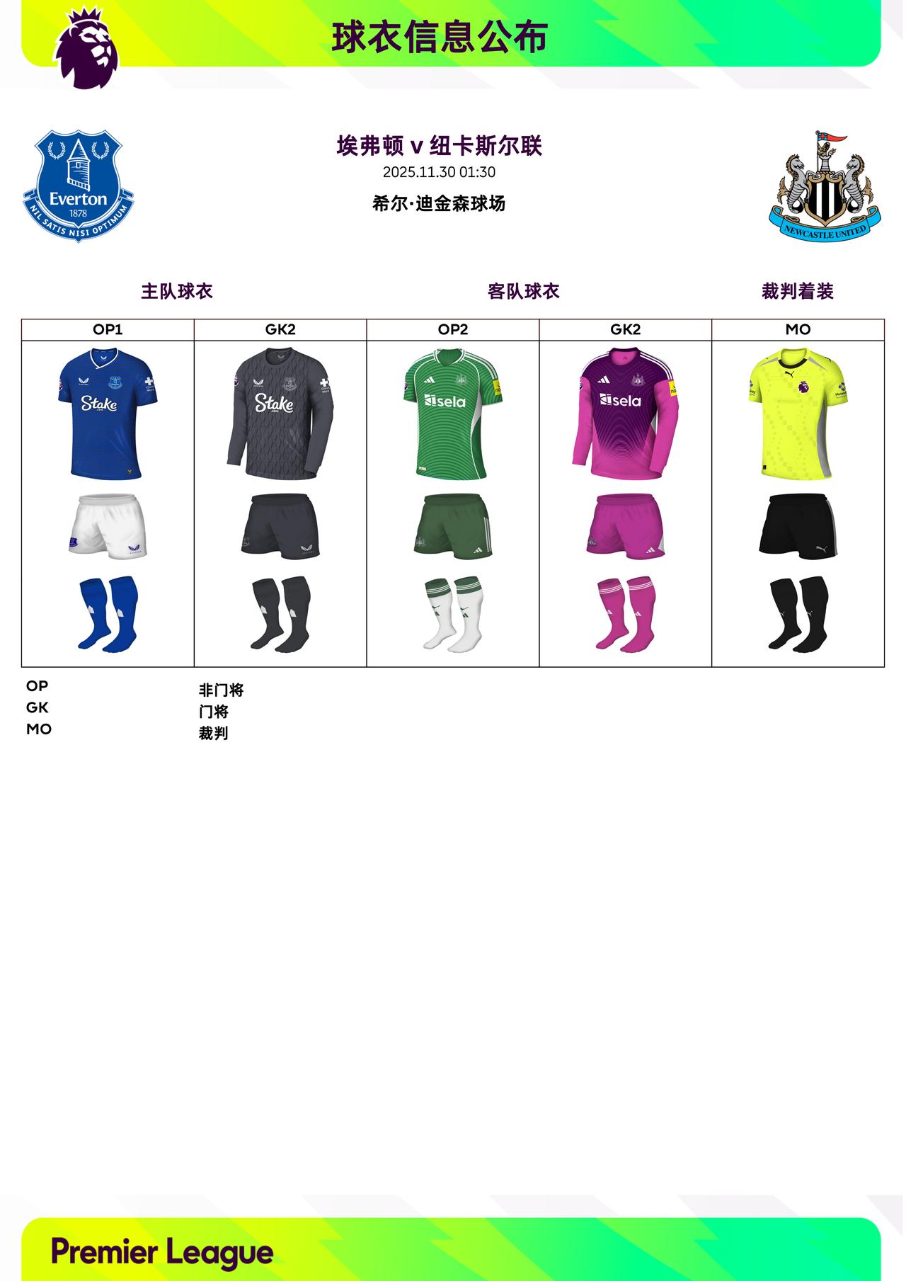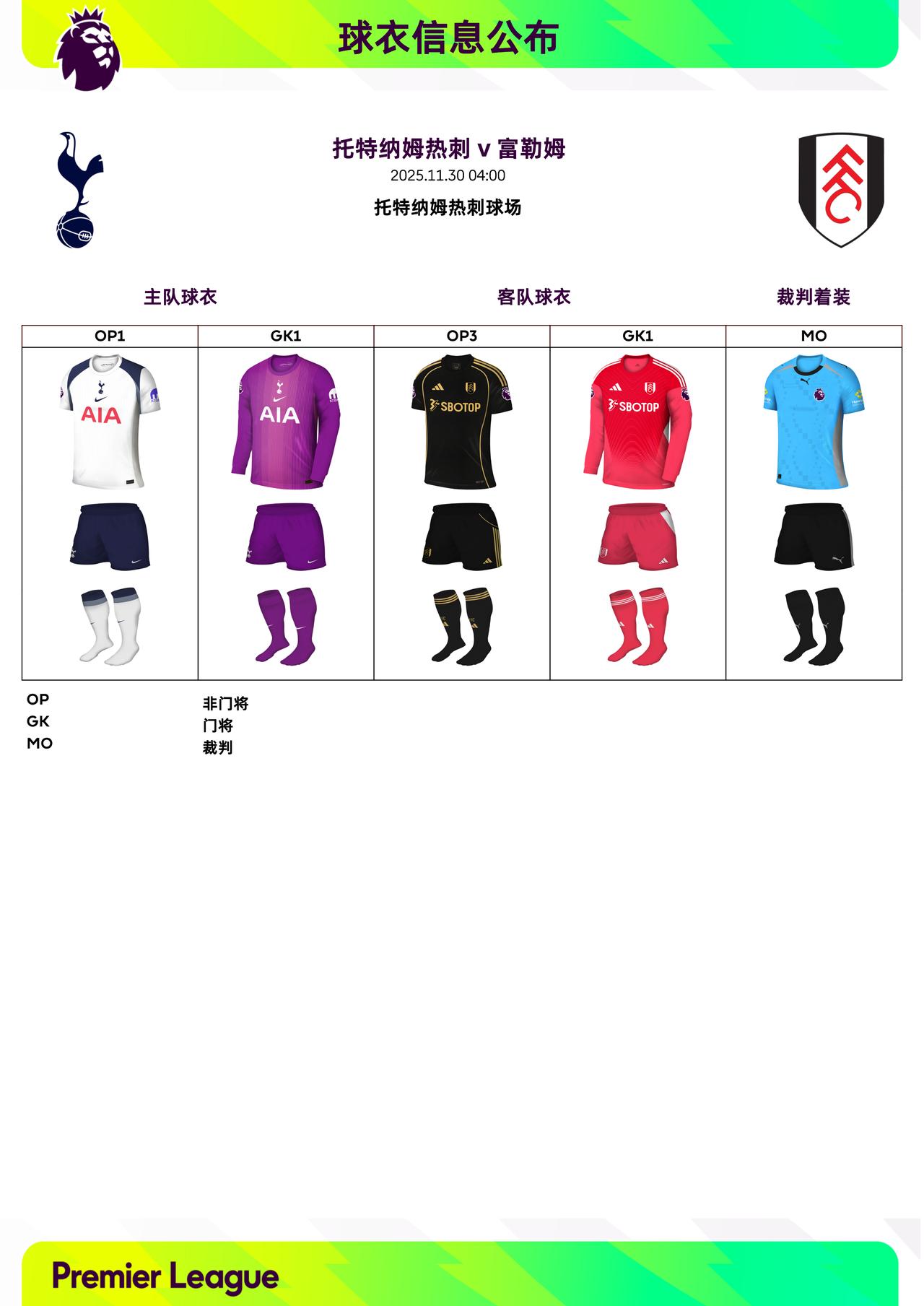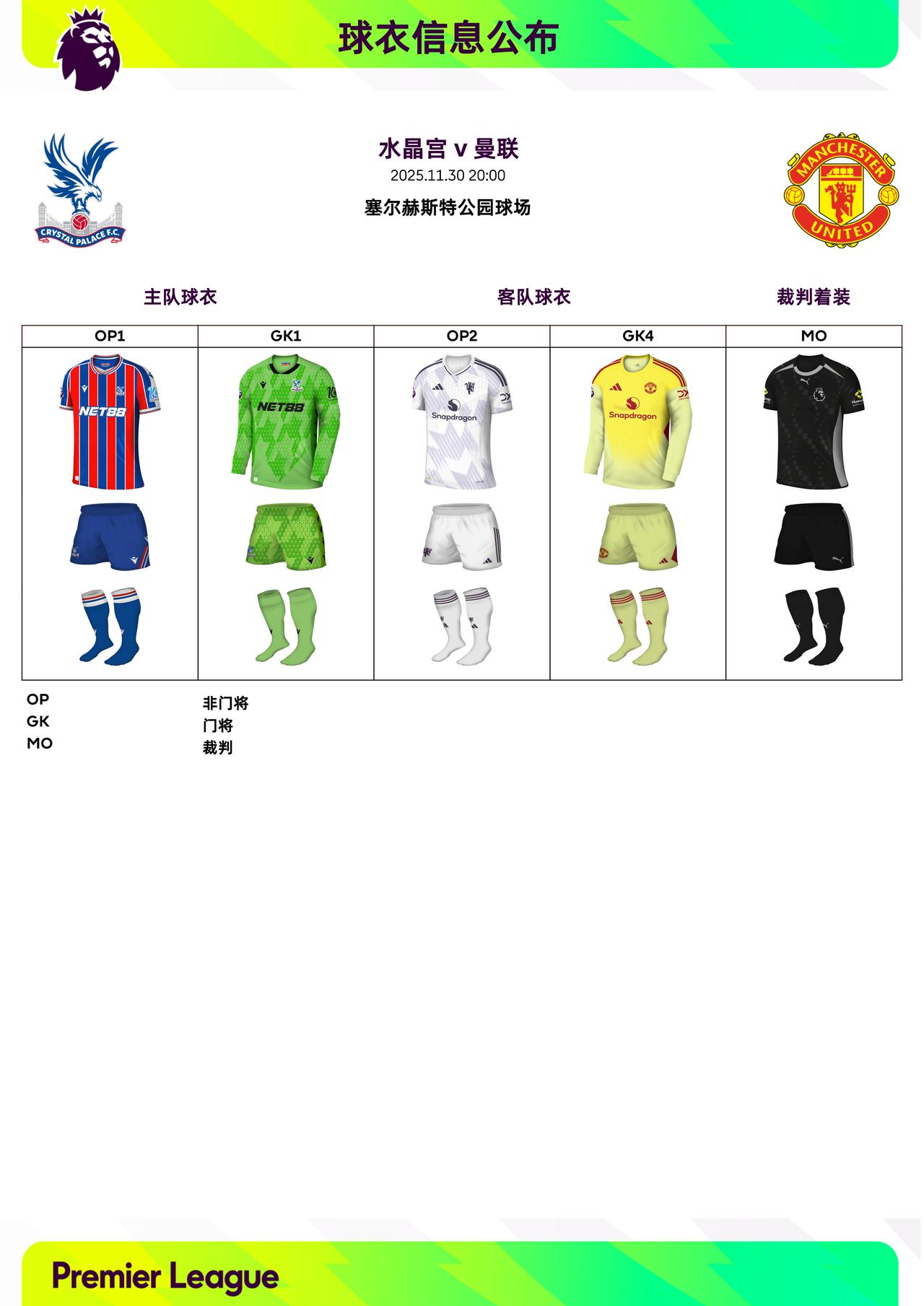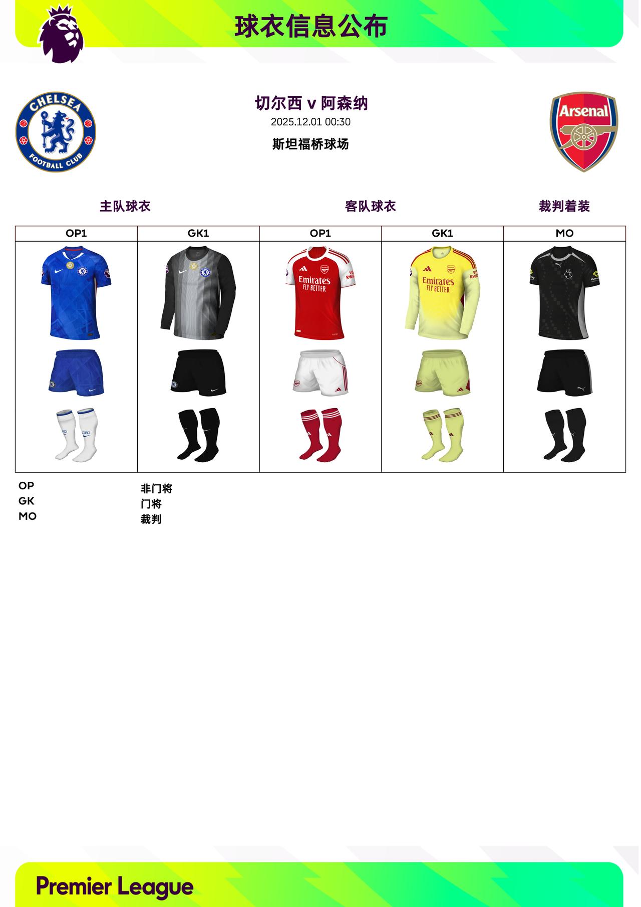 2025/26赛季英超联赛第13轮球衣信息: ◉ 焦点战——切尔西 v 阿森纳,双方均穿主场球衣