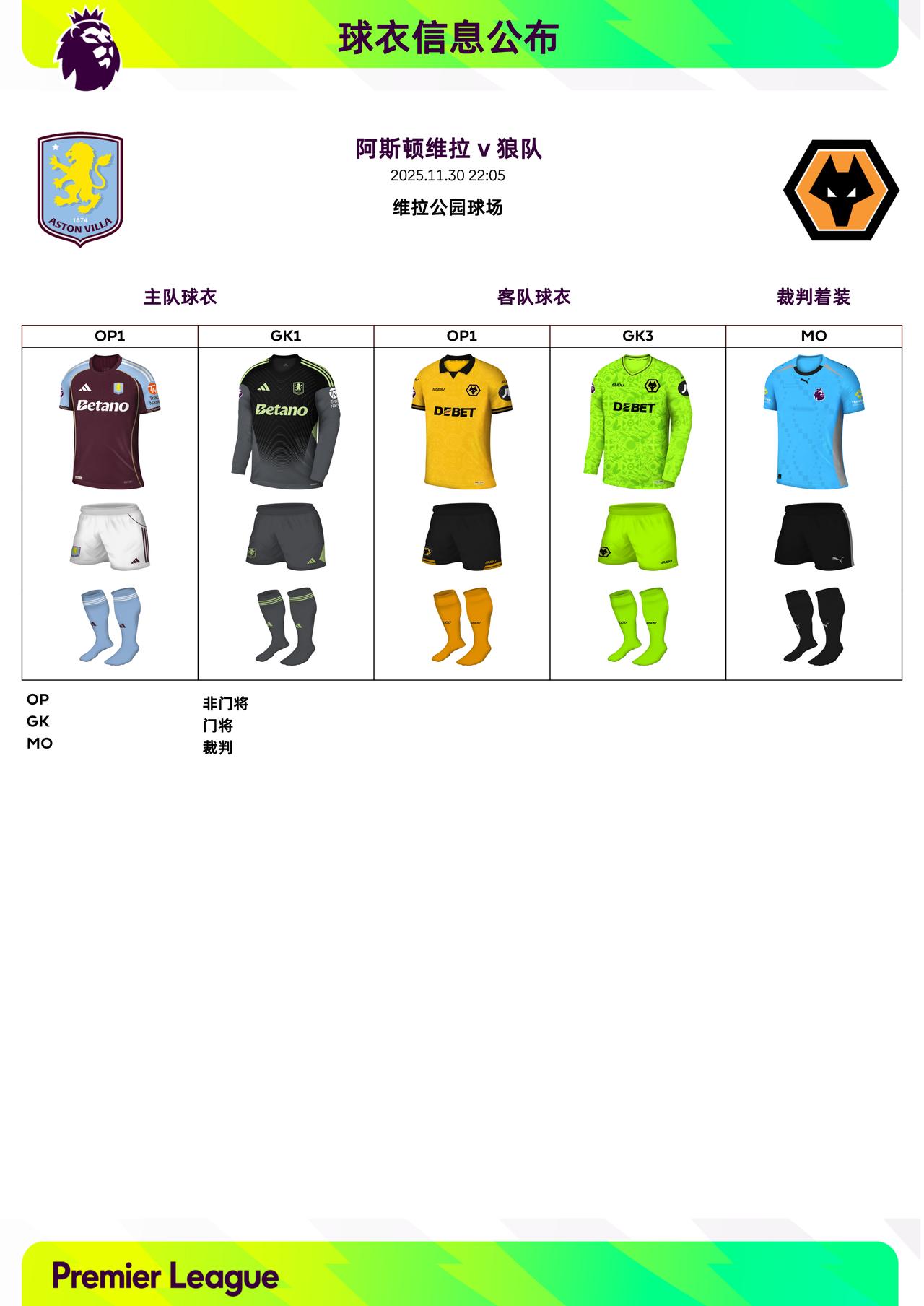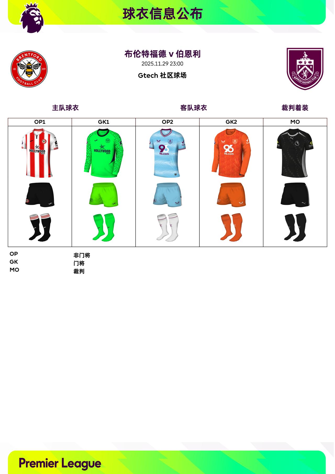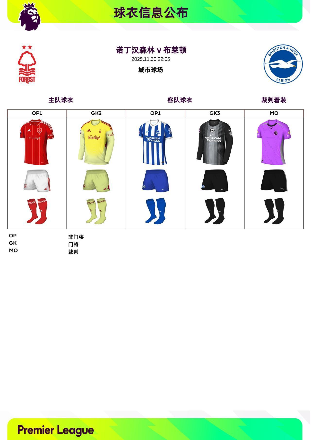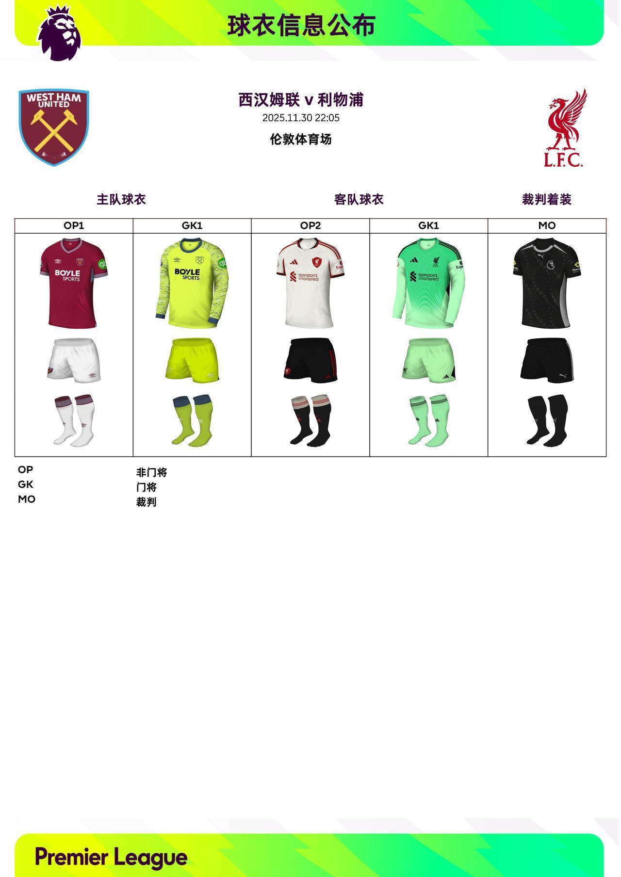 2025/26赛季英超联赛第13轮球衣信息: ◉ 焦点战——切尔西 v 阿森纳,双方均穿主场球衣